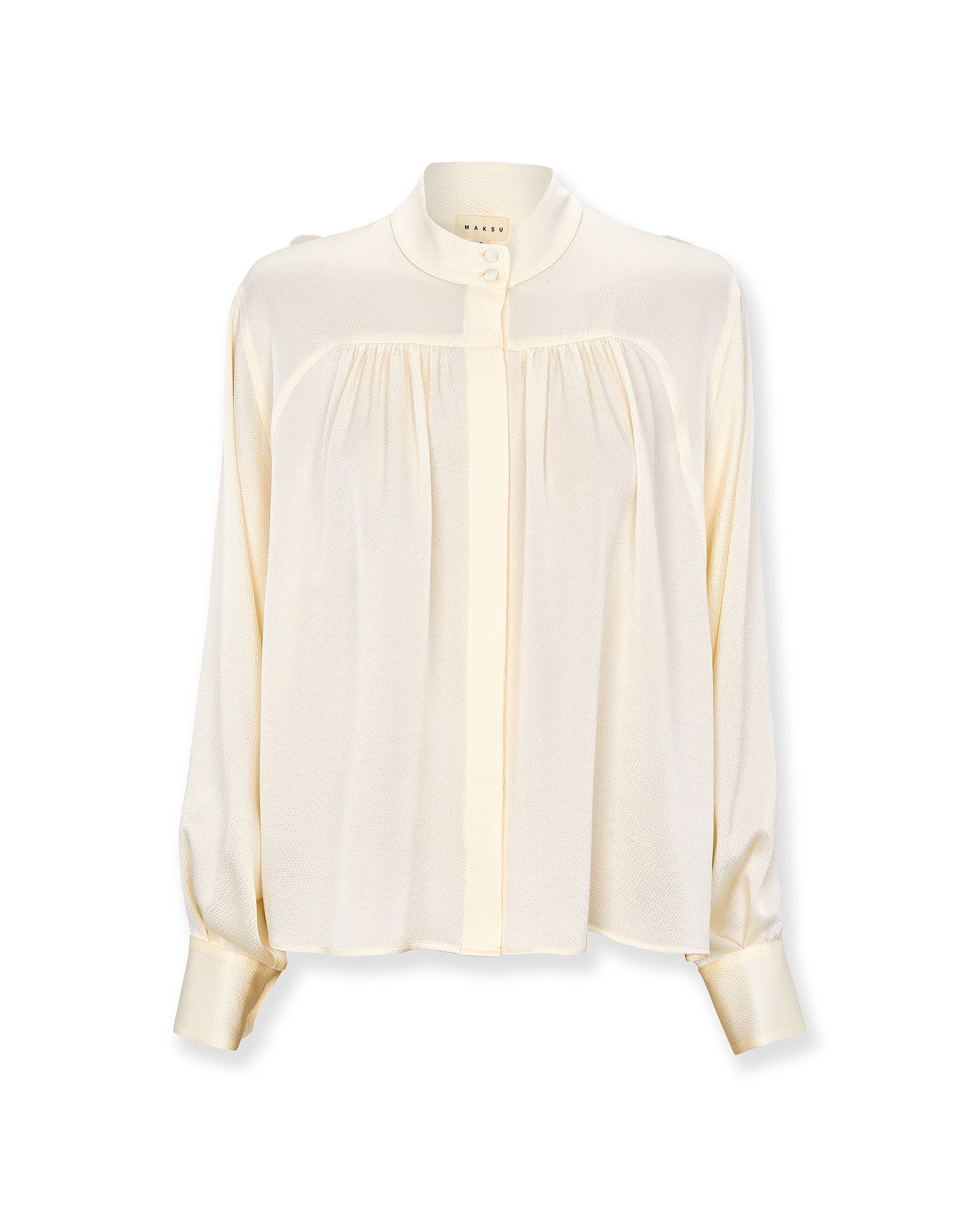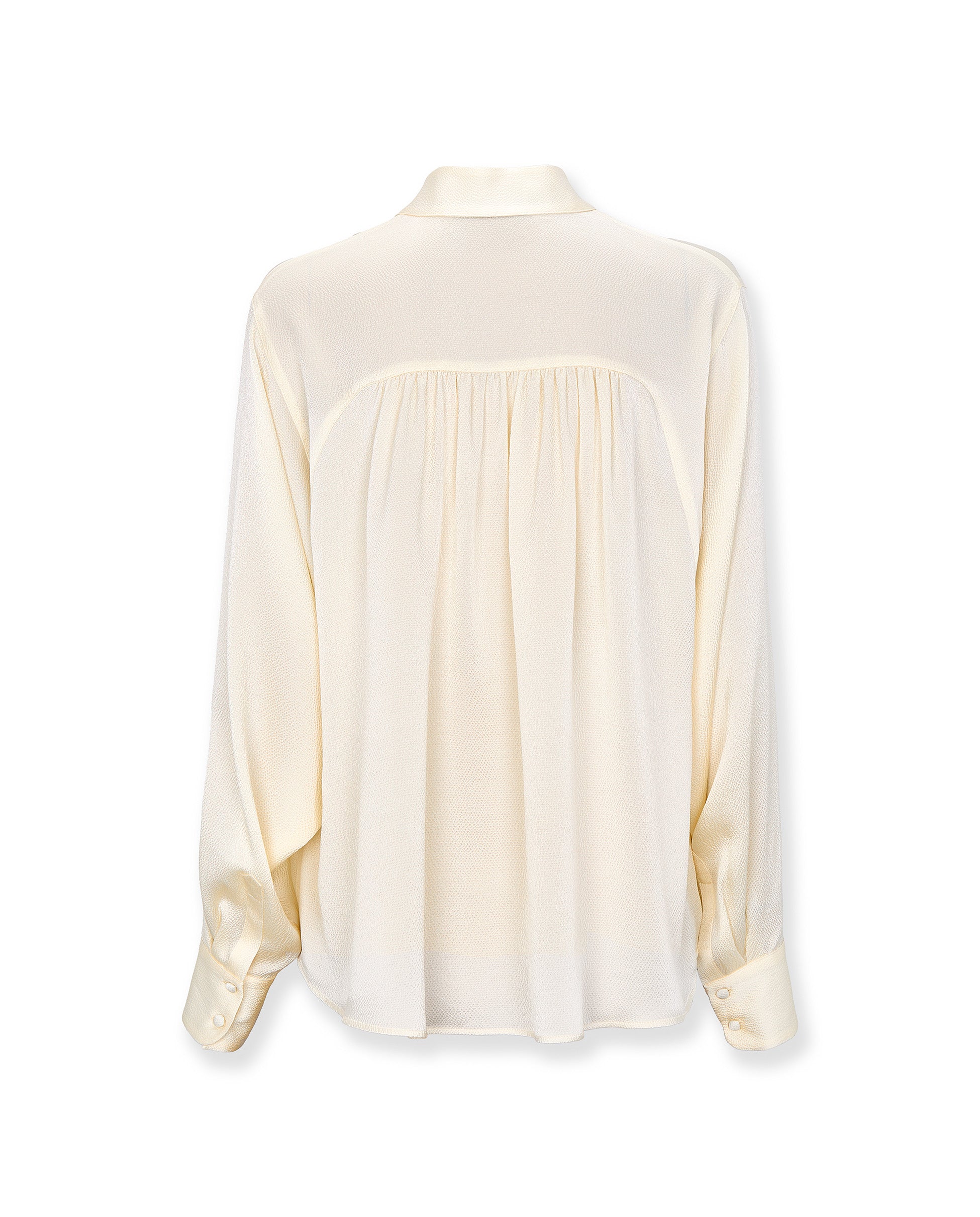 Zarif ve akıcı bir görünüme sahip Cloe bluz, hafif parlaklık taşıyan ipek kumaştan üretilmiştir. Ton-sur-ton dokusunun inceliğiyle öne çıkan model, üst kısmındaki büzgülü roba ve önden tam boy düğme kapamasıyla şık bir bitiş sunar. Rahat kesimi, yuvarlak etek ucu ve yapı kazandıran geniş manşetlerle tamamlanır.