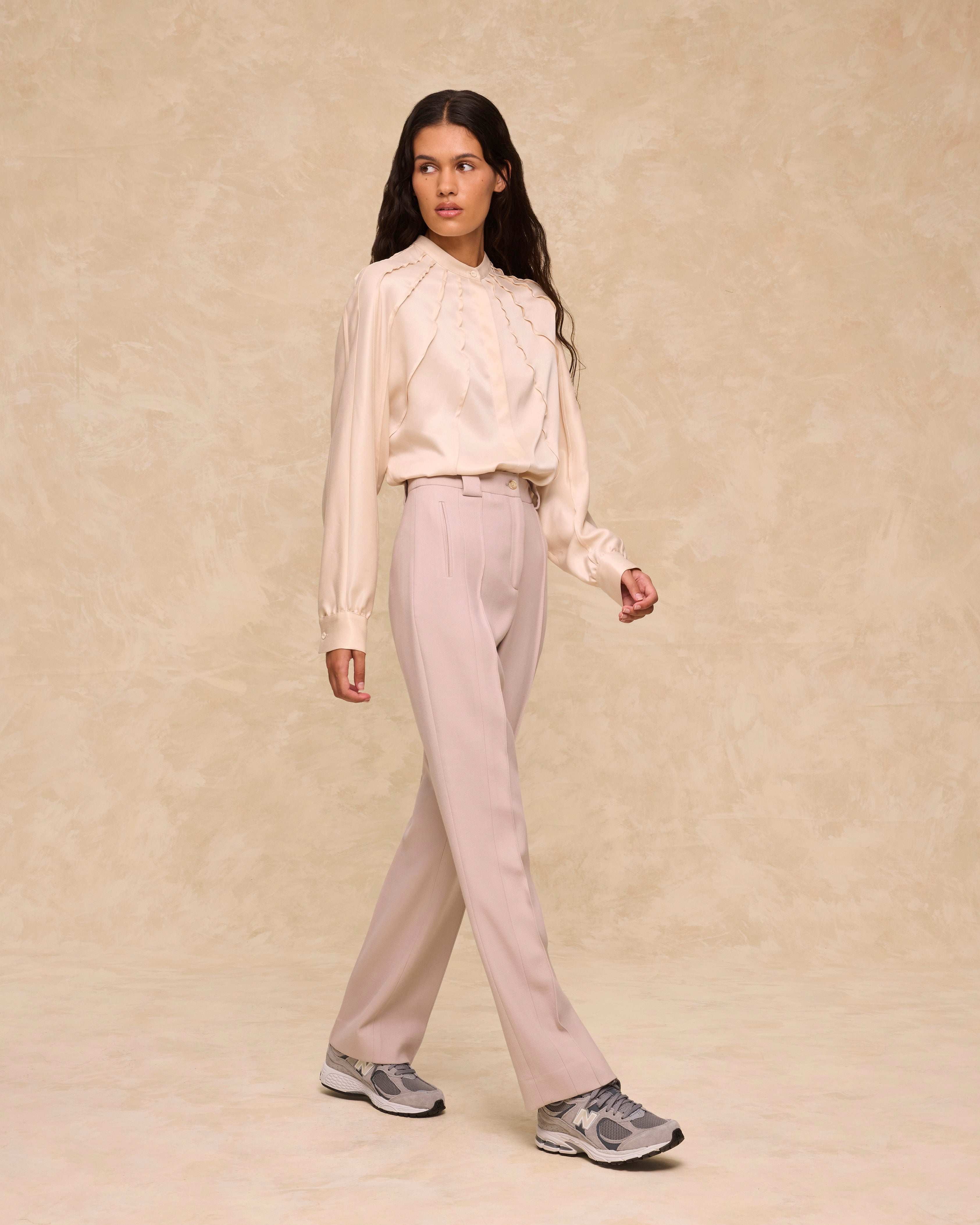 Hafif ve akıcı yapısıyla öne çıkan Erica bluz, yumuşak dokulu saten kumaştan üretilmiştir; zarif parlaklığı ve doğal dökümüyle sofistike bir görünüm sunar. Omuz ve sırt çizgilerini takip eden ince dalgalı dikişler, tasarıma feminen ve rafine bir bitiş katar. Mao yaka, gizli düğmeli ön kapama ve hafif büzgülü manşetler modern incelikle tamamlanmıştır.