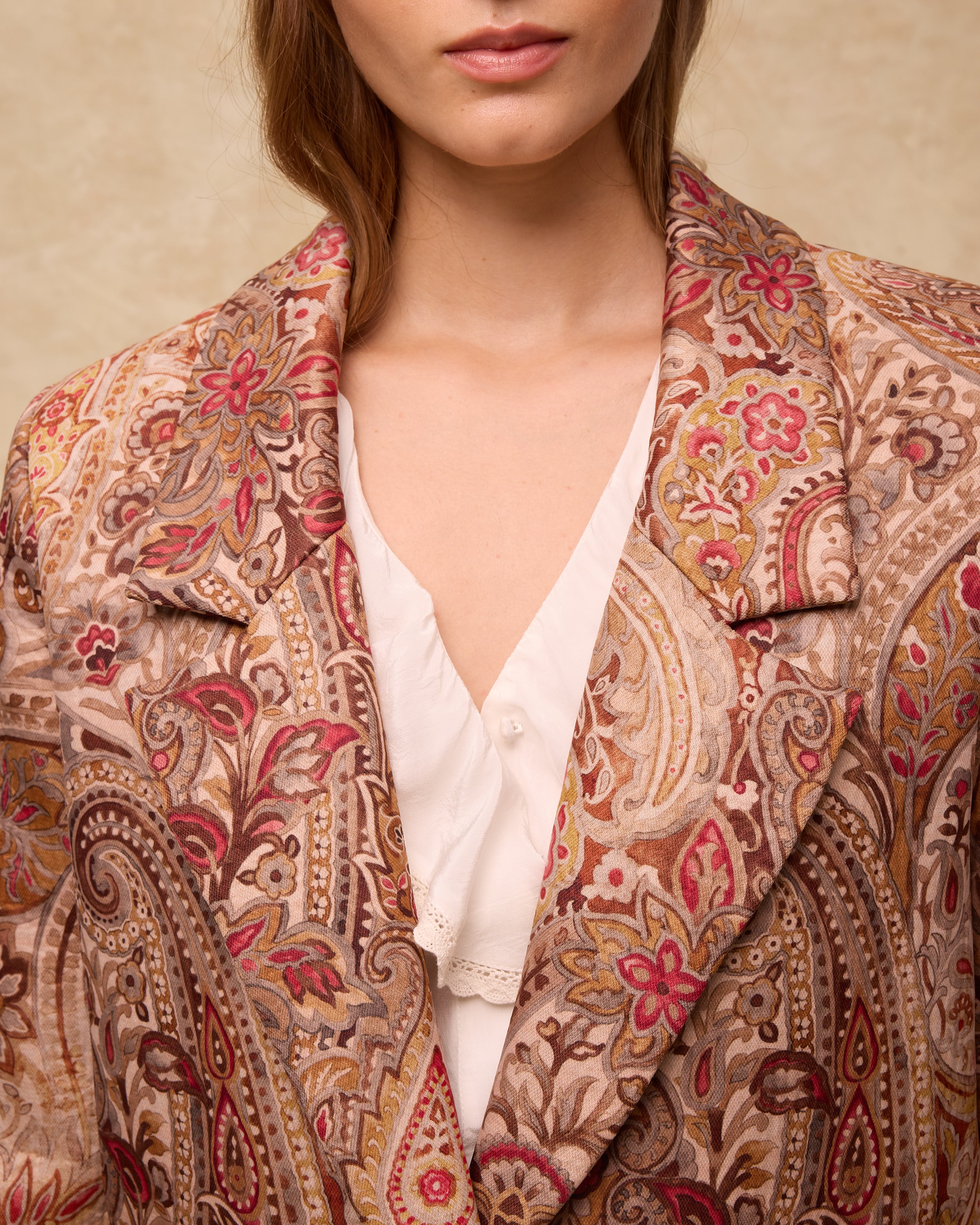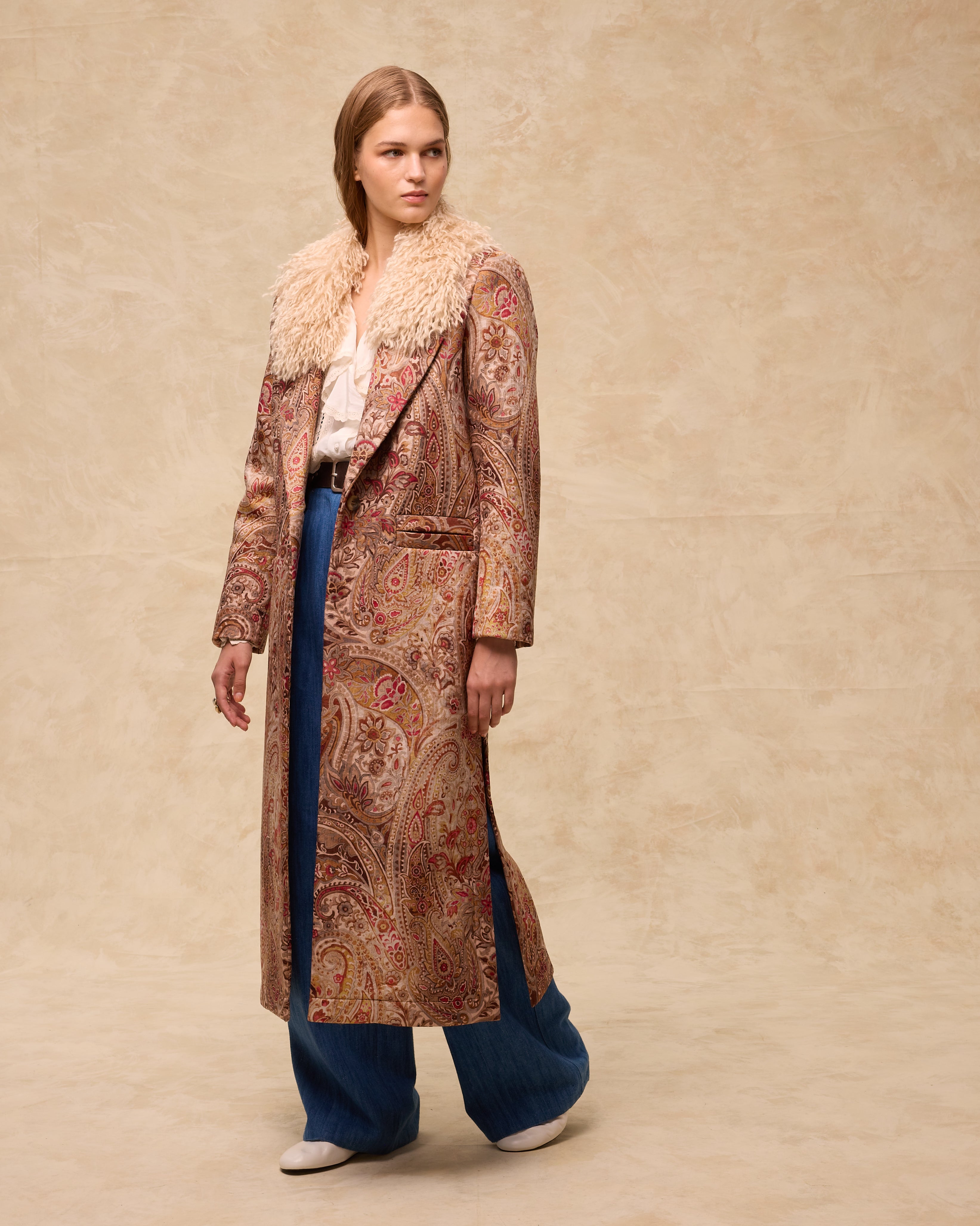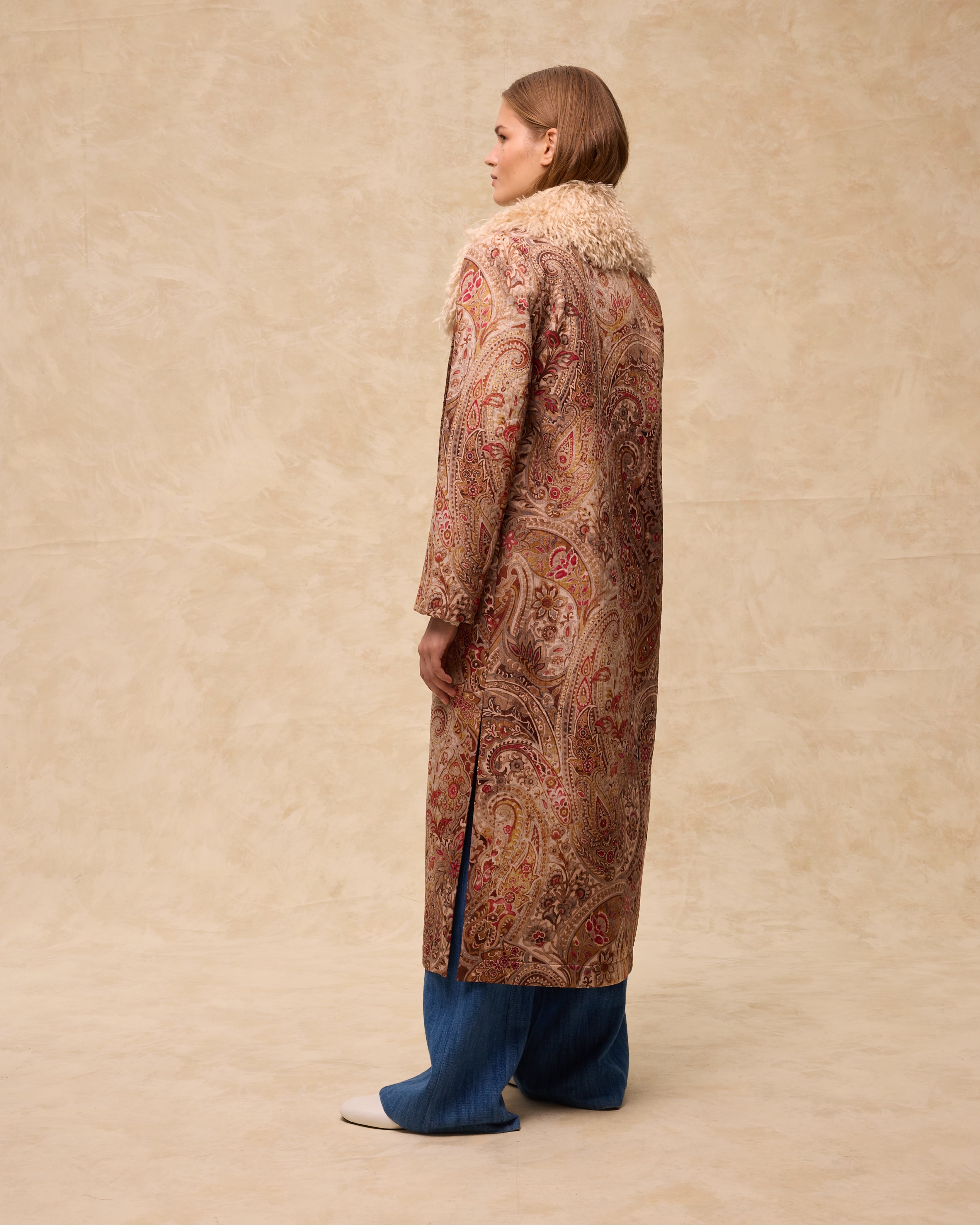 Vintage ruhu ve zamansız siluetiyle öne çıkan Erica kaban, sıcak tonlarda paisley desenli sofistike jakar kumaşıyla dikkat çeker. Dokulu ve hacim katan çıkarılabilir kürklü yakası tasarıma karakter kazandırırken, gövdeli jakar kumaşıyla uzun ve düz kesim formda tasarlanmıştır. Yan yırtmaçları hareket kolaylığı sağlarken, ön kapamasız yapısı kabanı çok yönlü bir katman haline getirir. Soğuk günlerde şıklık ve konforu bir araya getiren zamansız bir parçadır.
