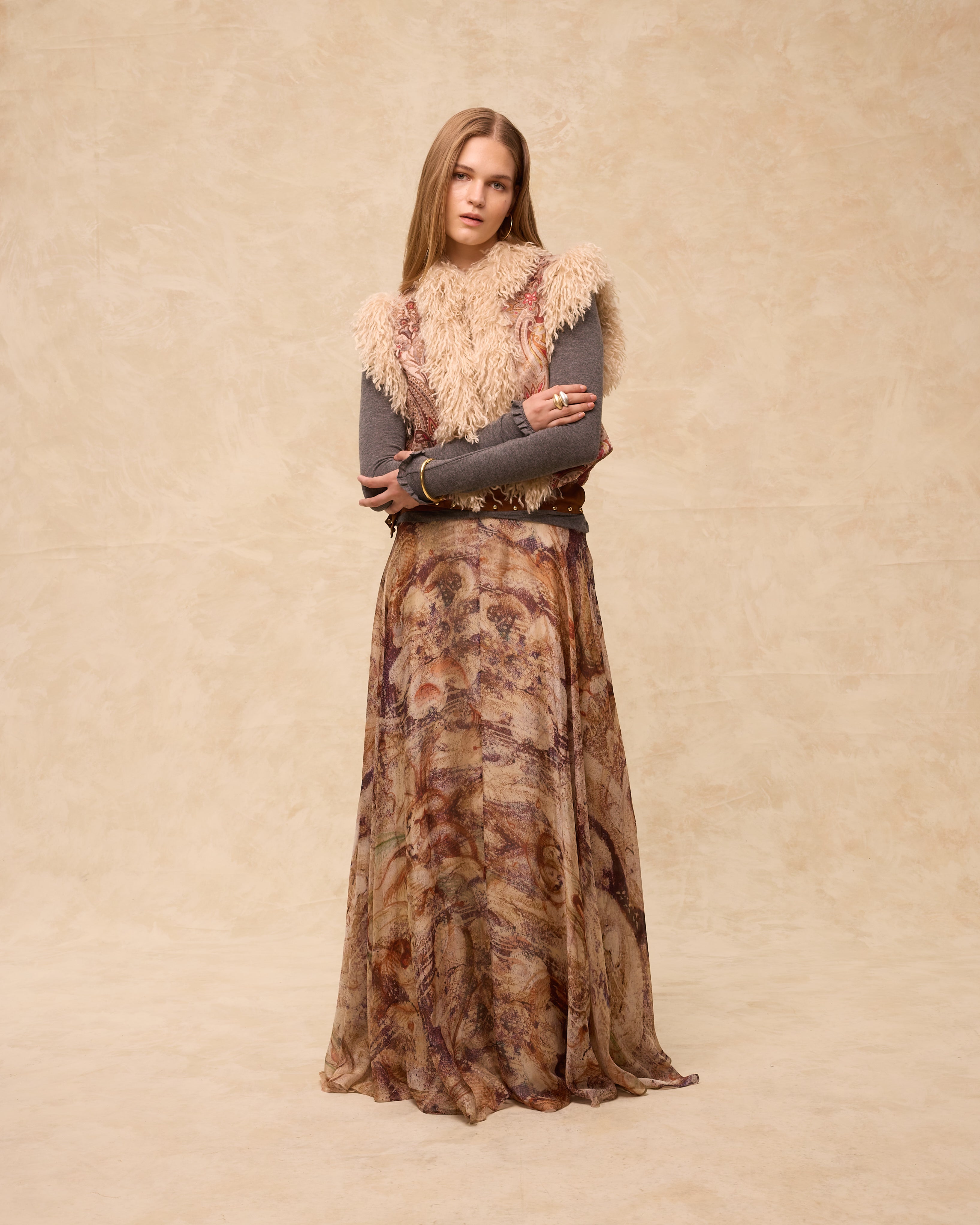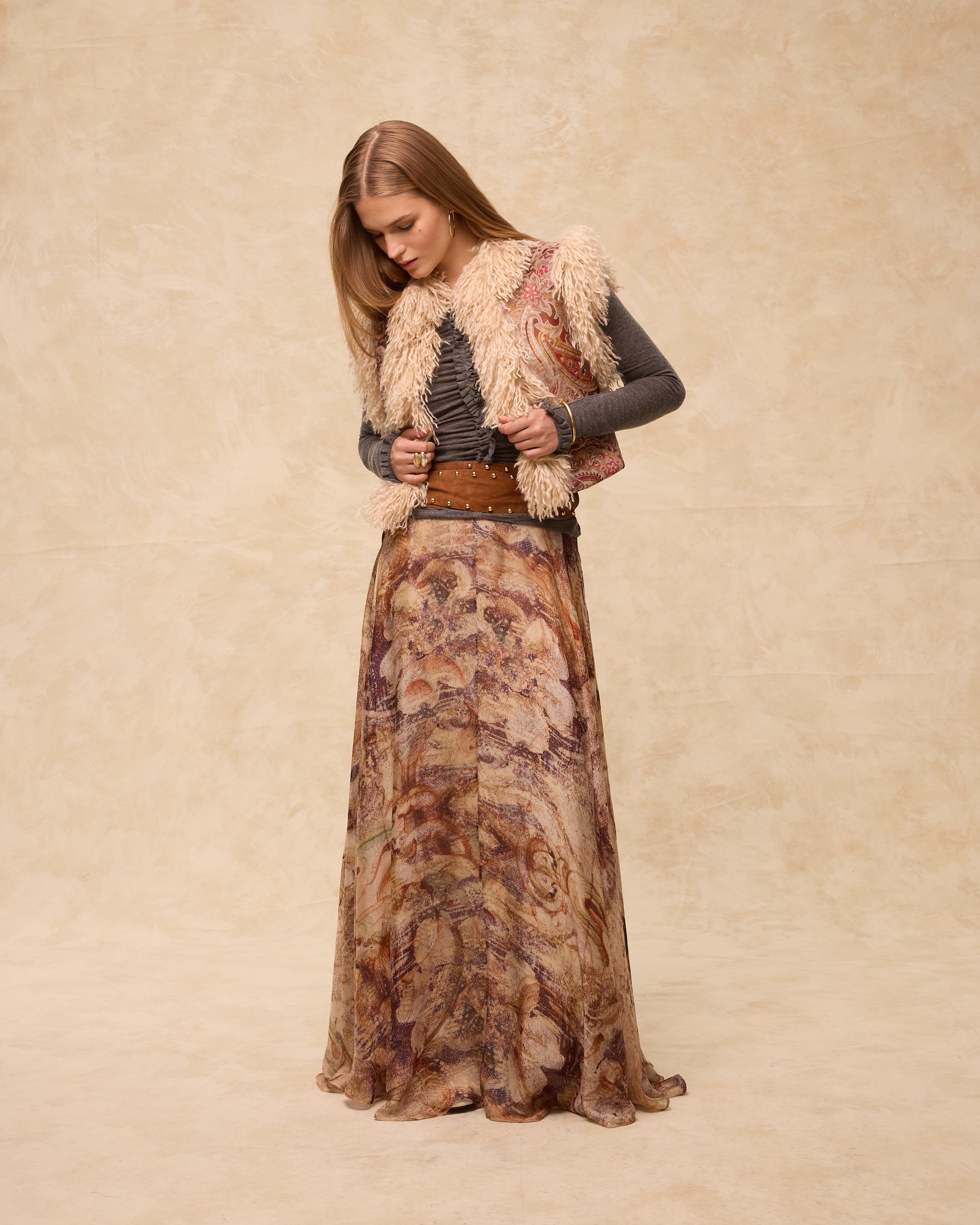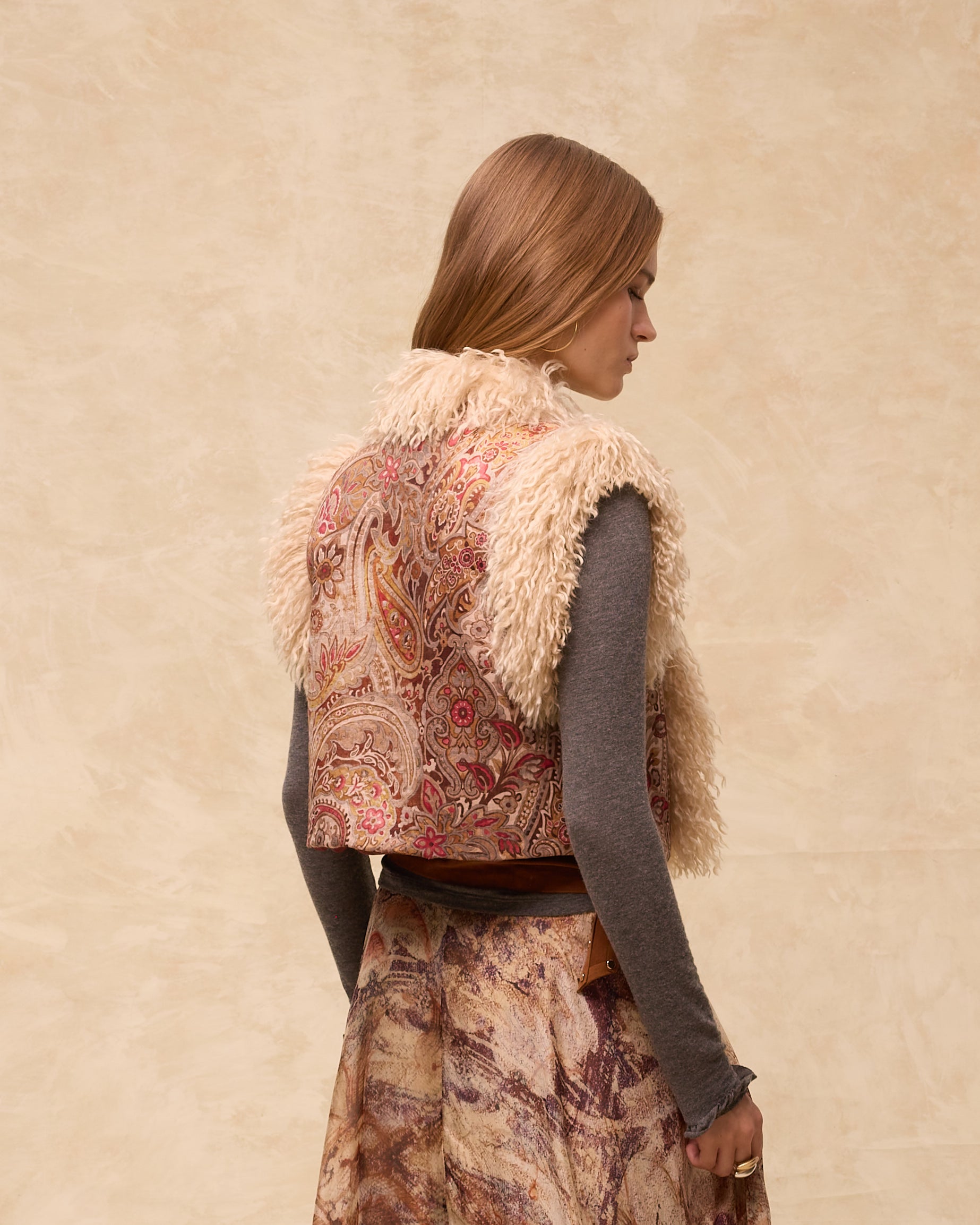 Vintage esintili dikkat çekici bir parça olan Erica yelek, sıcak tonlarda paisley desenli jakar kumaştan üretilmiştir. Dokulu ve hacimli görünüm katan kürklü yakasıyla öne çıkar. Kısa ve önü açık silueti, bohem ya da sofistike stillerle uyum sağlayan çok yönlü bir katman sunar. Dar kesim bluzlar ya da akıcı elbiselerle kombinlenerek şık bir bütünlük oluşturur.