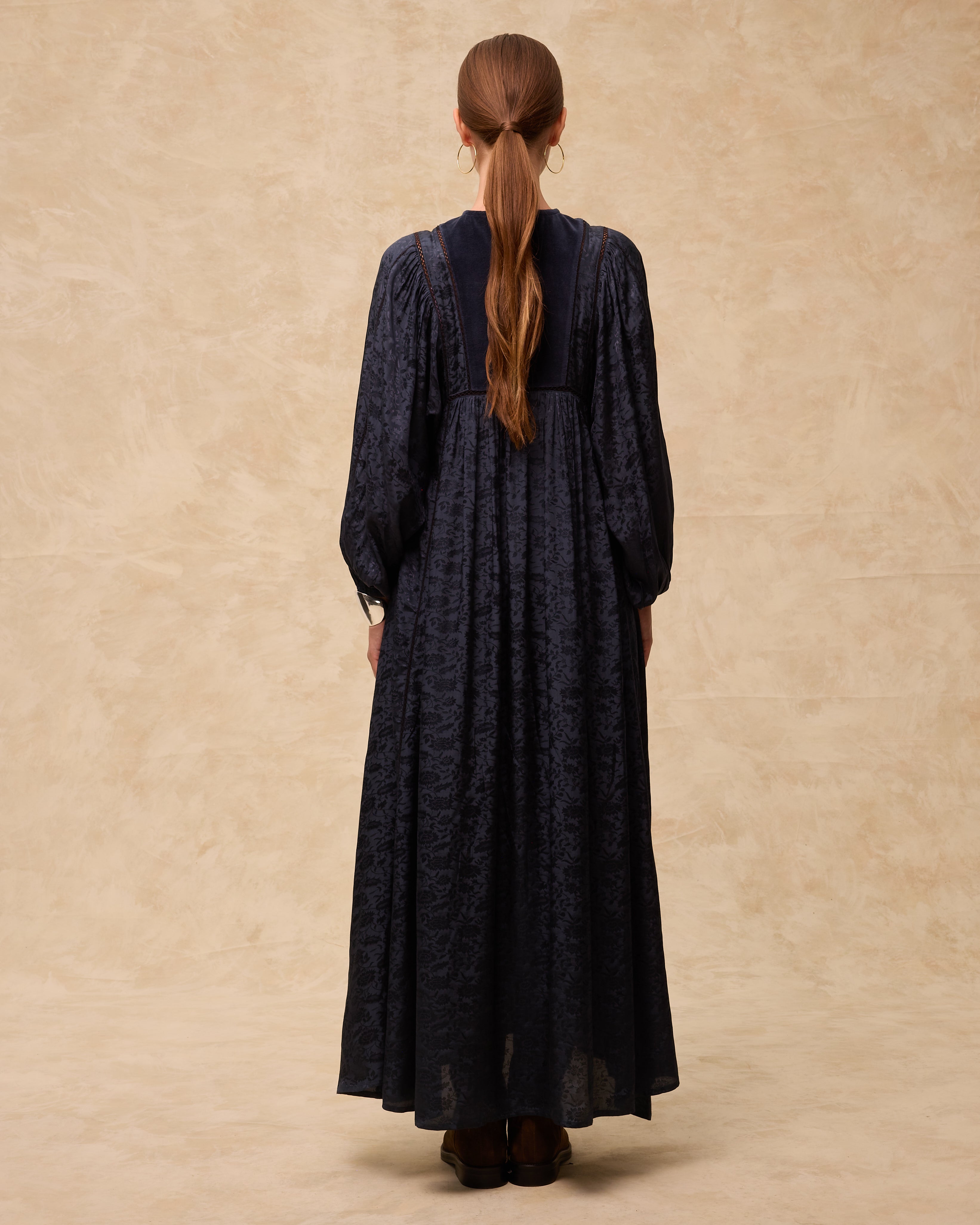 Doku ve detayın buluştuğu Amal elbise, romantik çiçek nakışlarını akıcı jakar zeminle bir araya getirir. Derin antrasit tonunda tasarlanan model, gövdedeki zarif büzgüler ve hacimli uzun kollarla geniş midi siluete dökülür. Ön panel, canlı çiçek nakışlarıyla süslenerek kontrast ve el işçiliği bir bitiş kazandırır. Yaka kısmı, ton-sur-ton düğmeli ince bir ojal kapamayla tamamlanır.