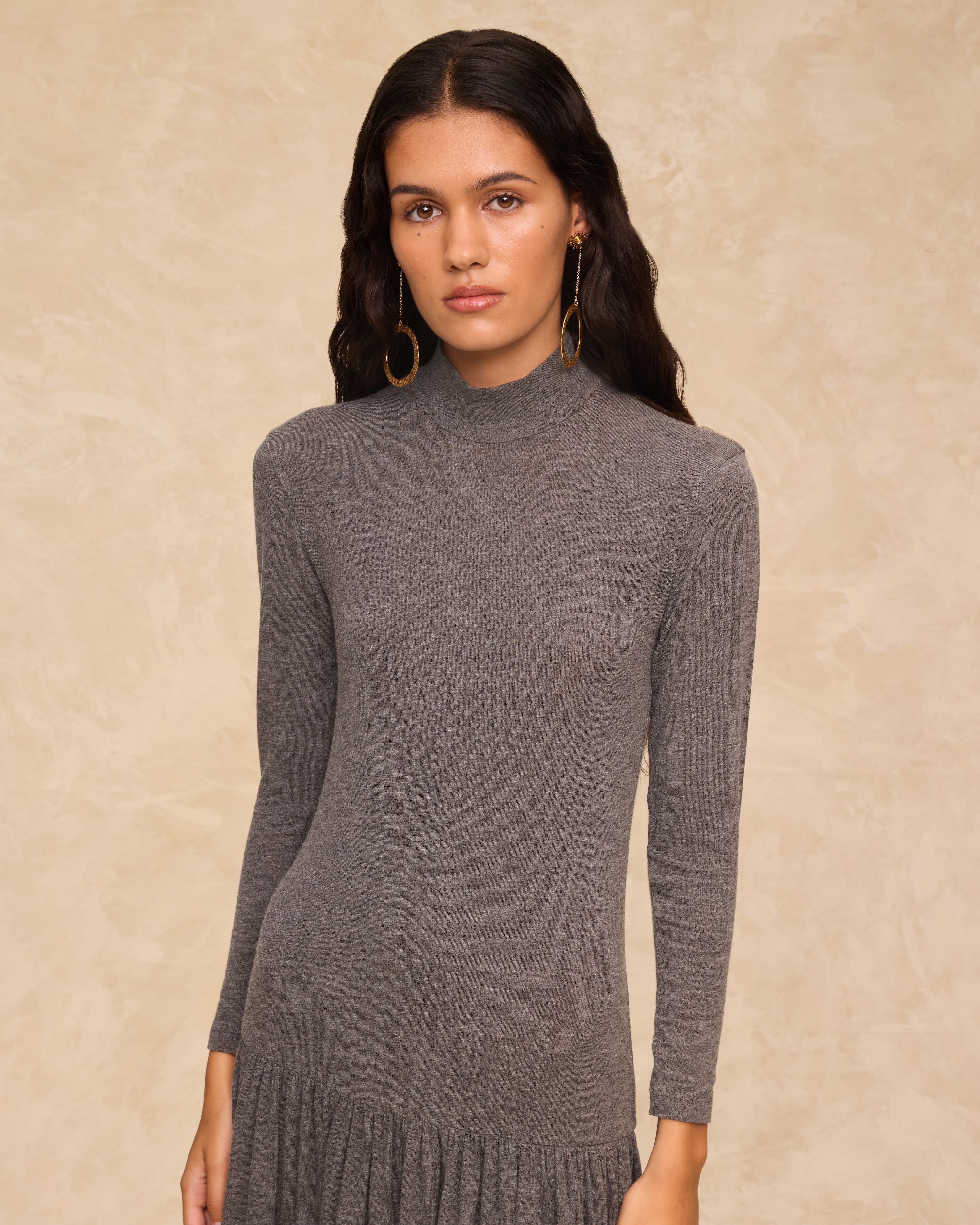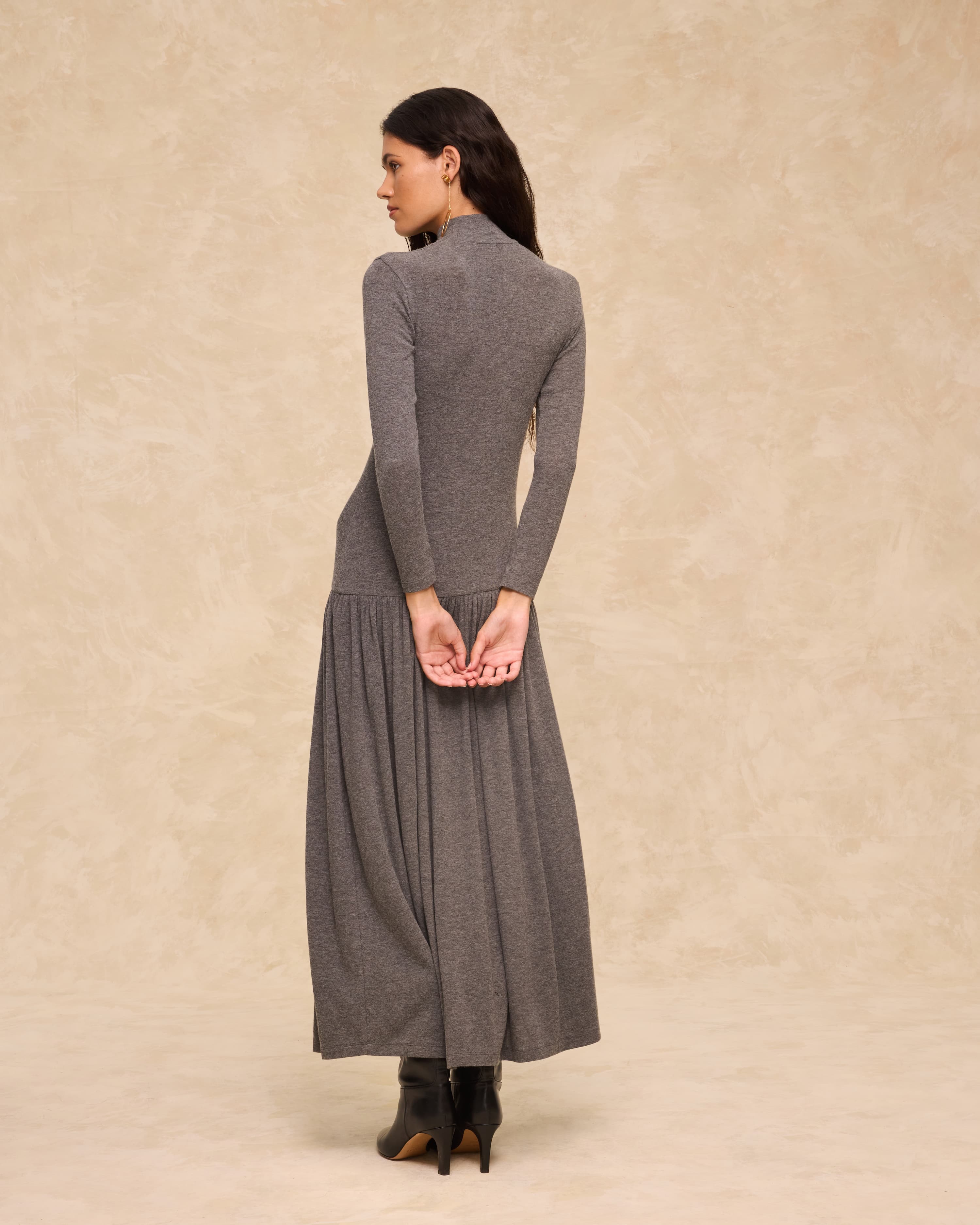 Minimalist ve sofistike bir stile sahip Boby elbise, hafif ve yumuşak triko kumaştan üretilmiştir; bedene konforlu bir şekilde uyum sağlar. Yüksek yakası, uzun kolları ve kalçadan aşağıya doğru büzgüyle genişleyen kloş etek yapısı, tasarıma hareket ve akış katar. Rahat zarafet ile zamansız bir dokunun sıcaklığını bir araya getiren çok yönlü bir parçadır.