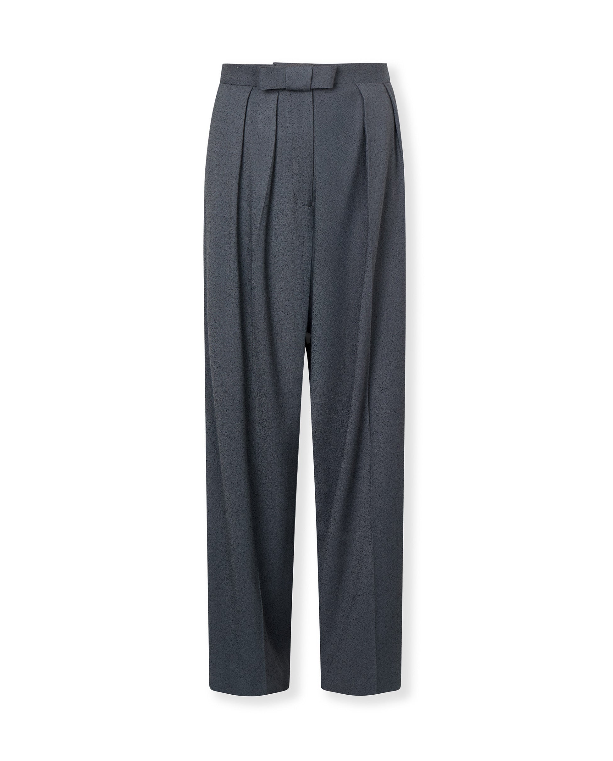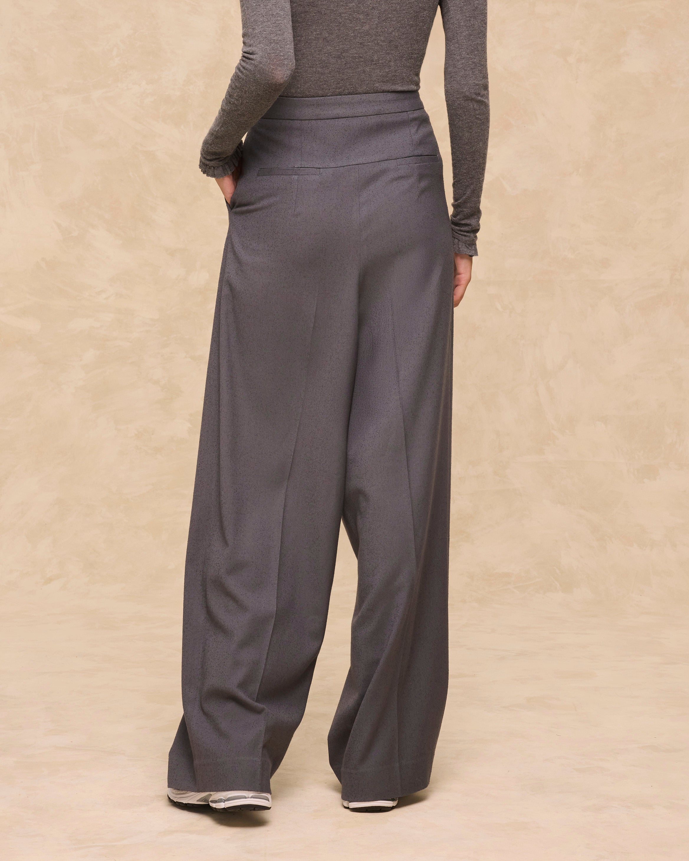• Yüksek bel ve yapılandırılmış pliselere sahip geniş paça kesim