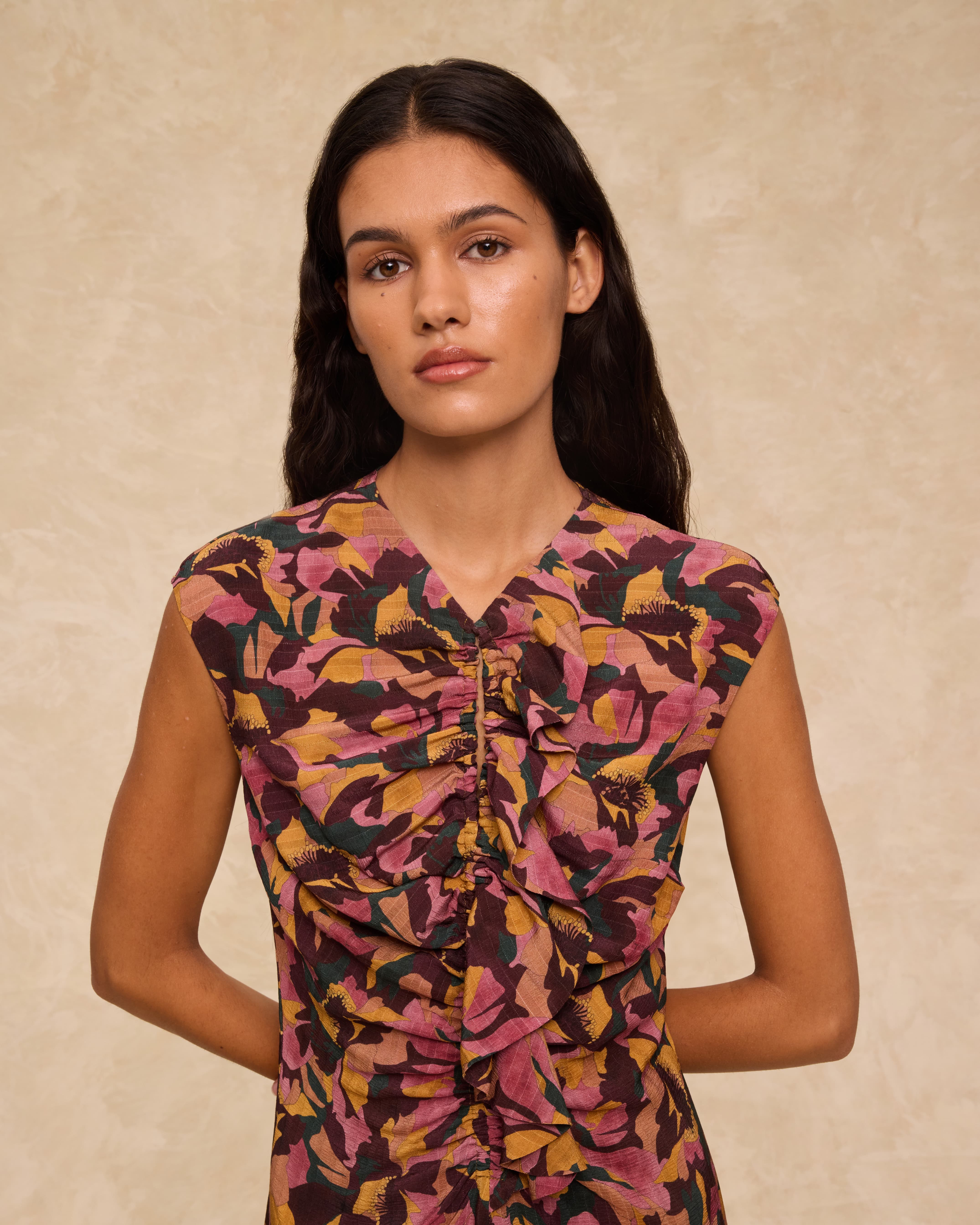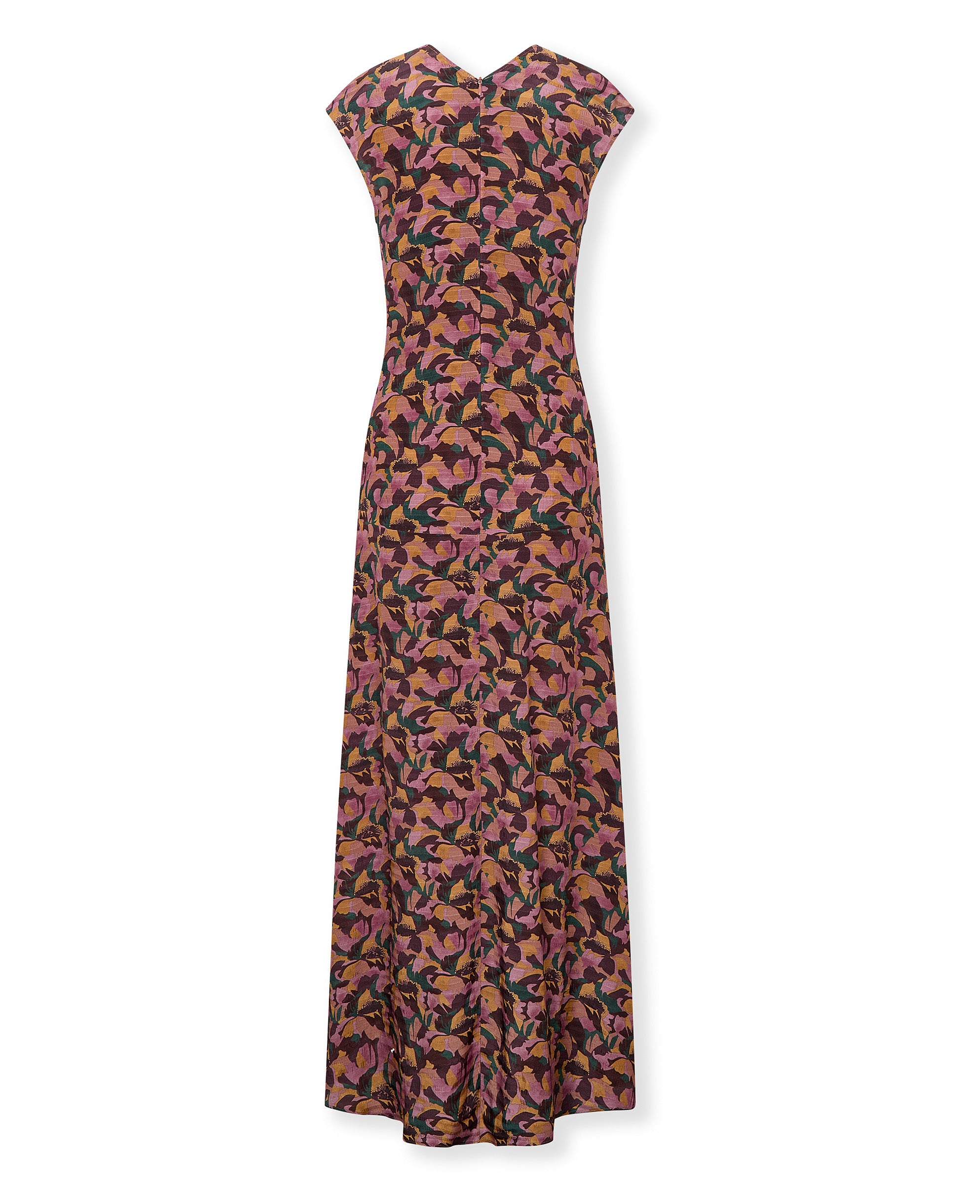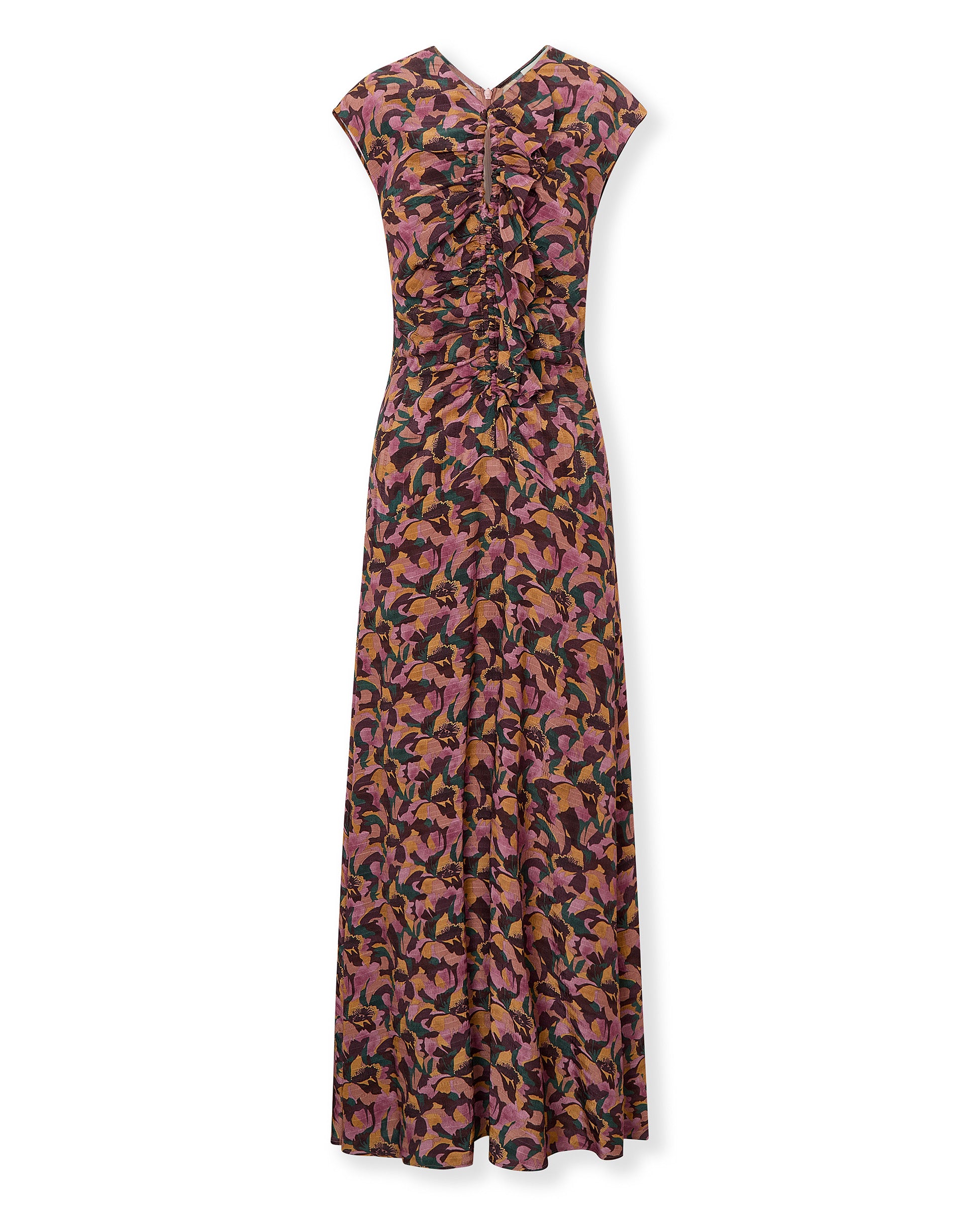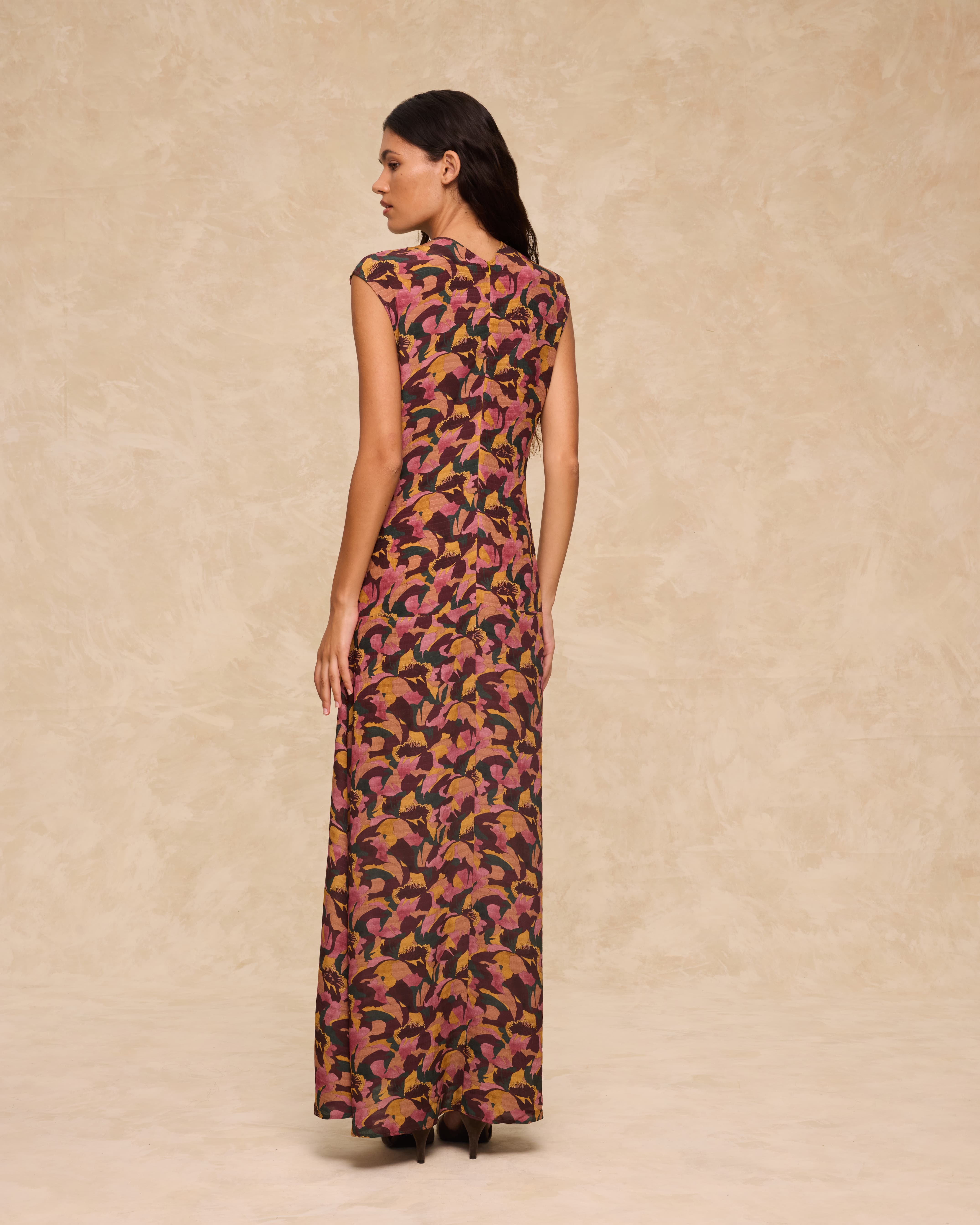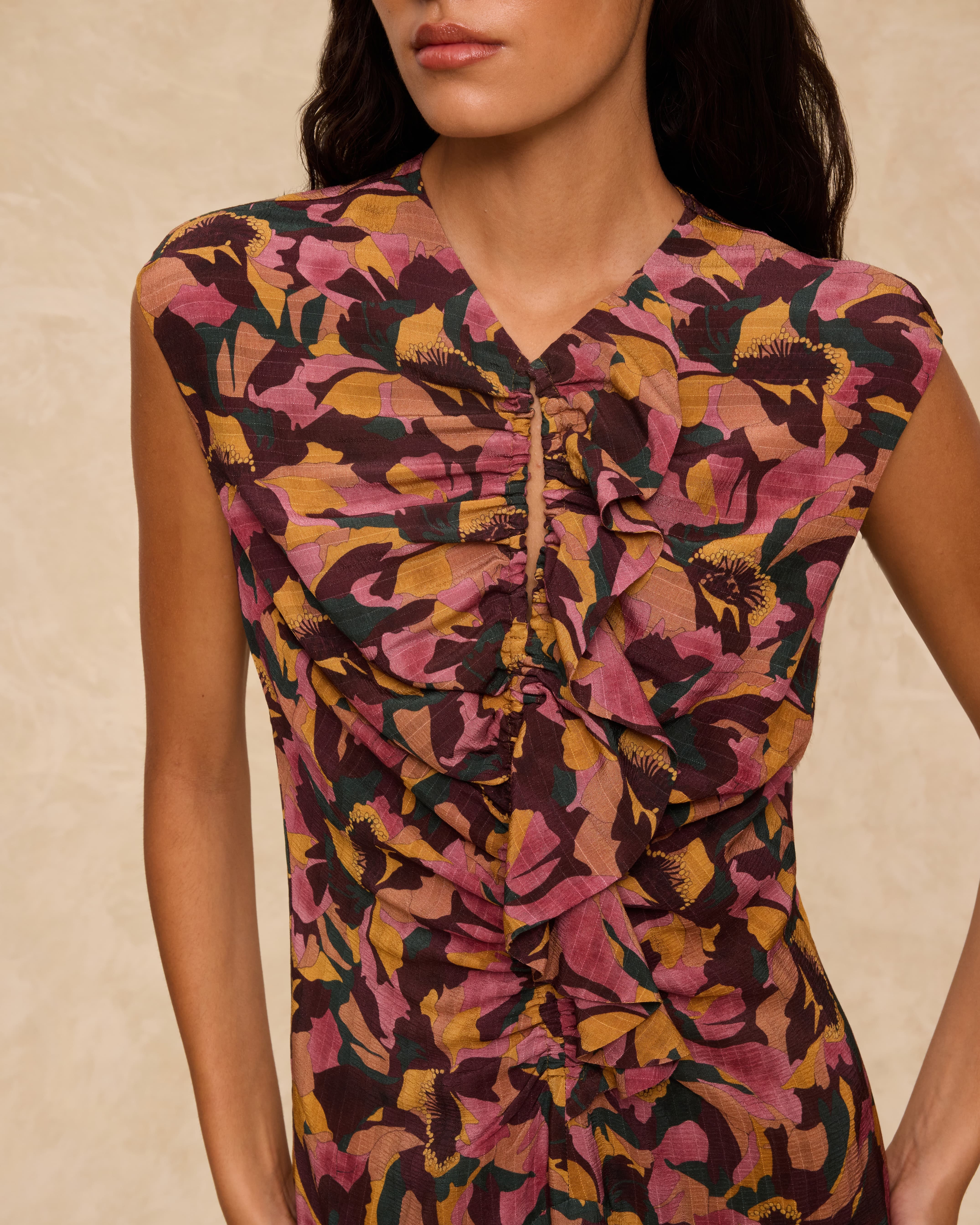 Gösterişli çiçek deseniyle öne çıkan Saachi elbise, ön kısmındaki volanlı panel, zarif büzgüler ve yaka kısmındaki küçük damla kesim detayıyla feminen bir görünüm sunar. Kolsuz, uzun silueti bedeni zarifçe sarar ve arkadaki gizli fermuarla tamamlanır.
