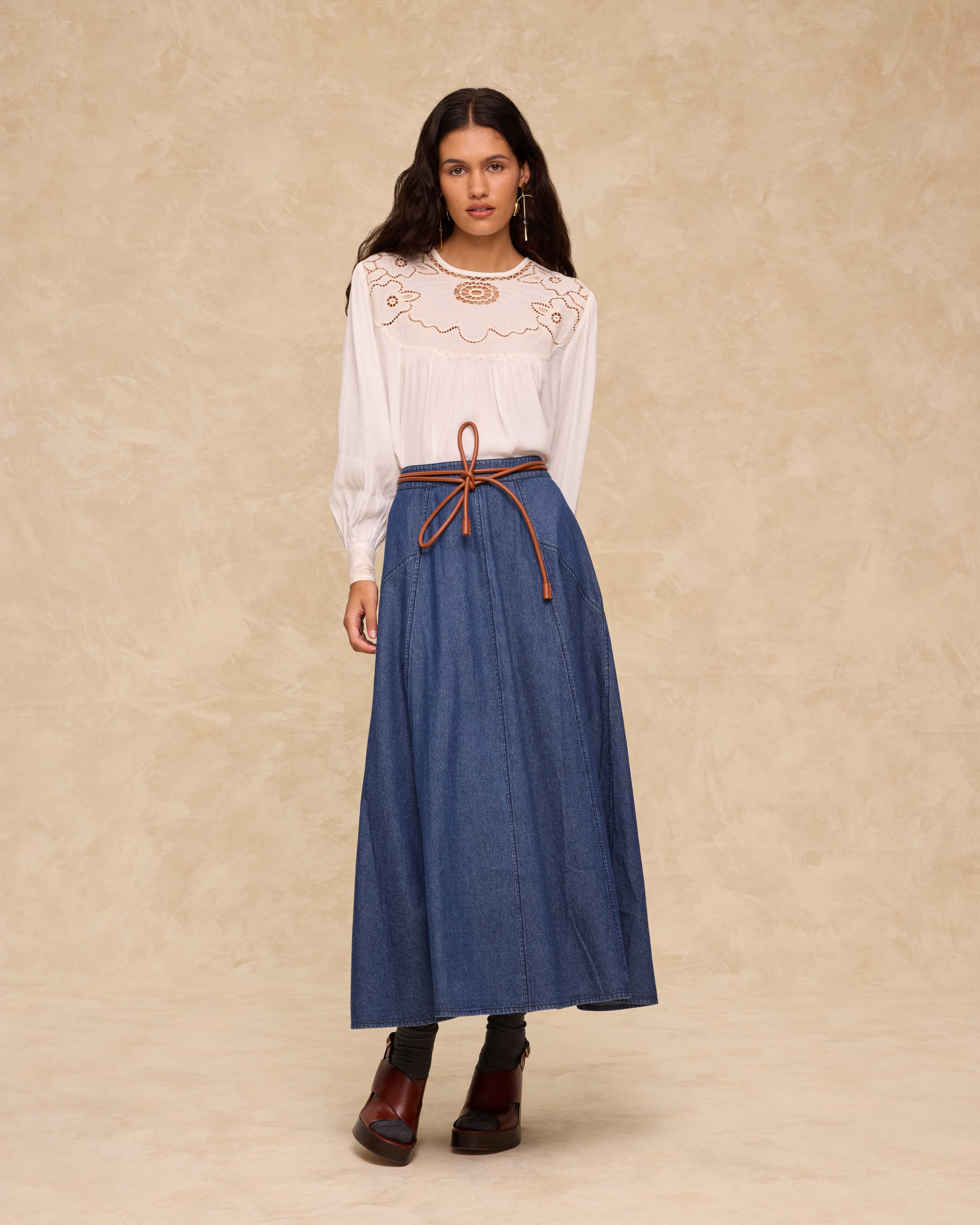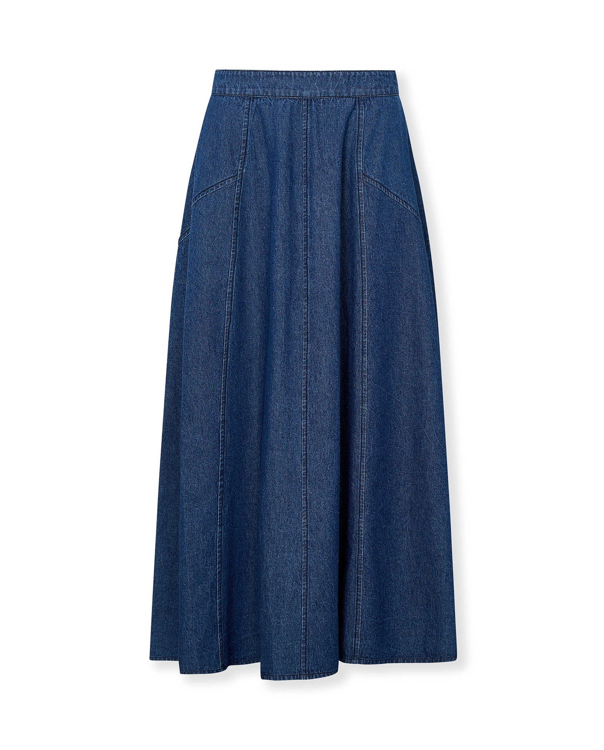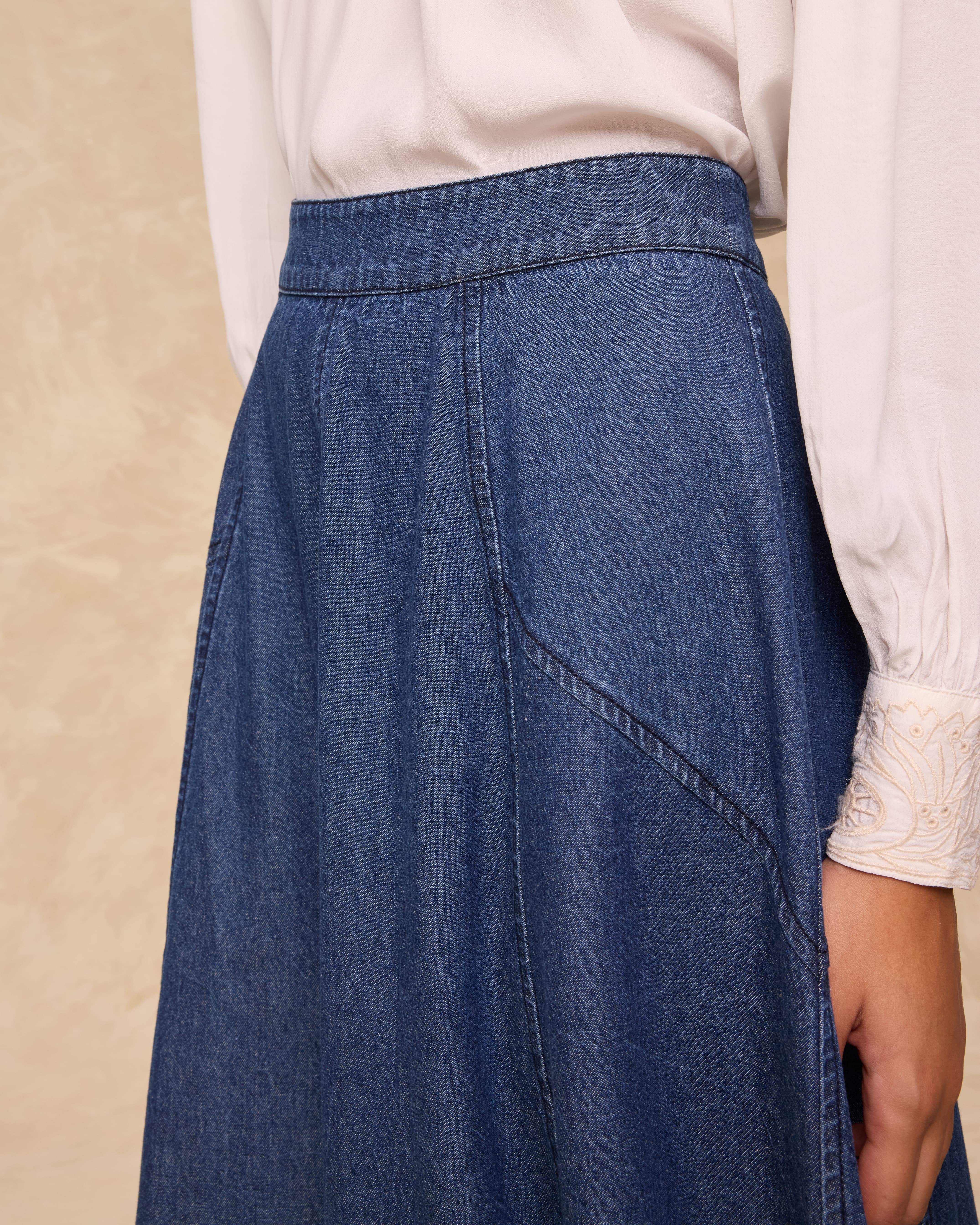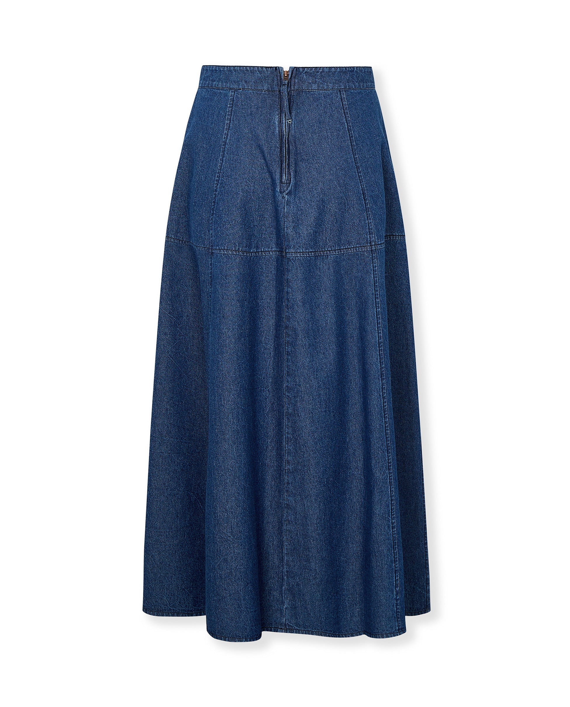 %100 pamuk indigo denimden üretilen Sienna etek, yapısı ile akıcı formu bir araya getirerek feminen bir siluet sunar. Yüksek bel ve kloş kesimi, açılı panel dikişleri ve ince kontrast dikişlerle vurgulanır. Arkadaki gizli fermuar, temiz bir bitiş sağlarken, klasik denim tasarımına sofistike bir yorum katar.