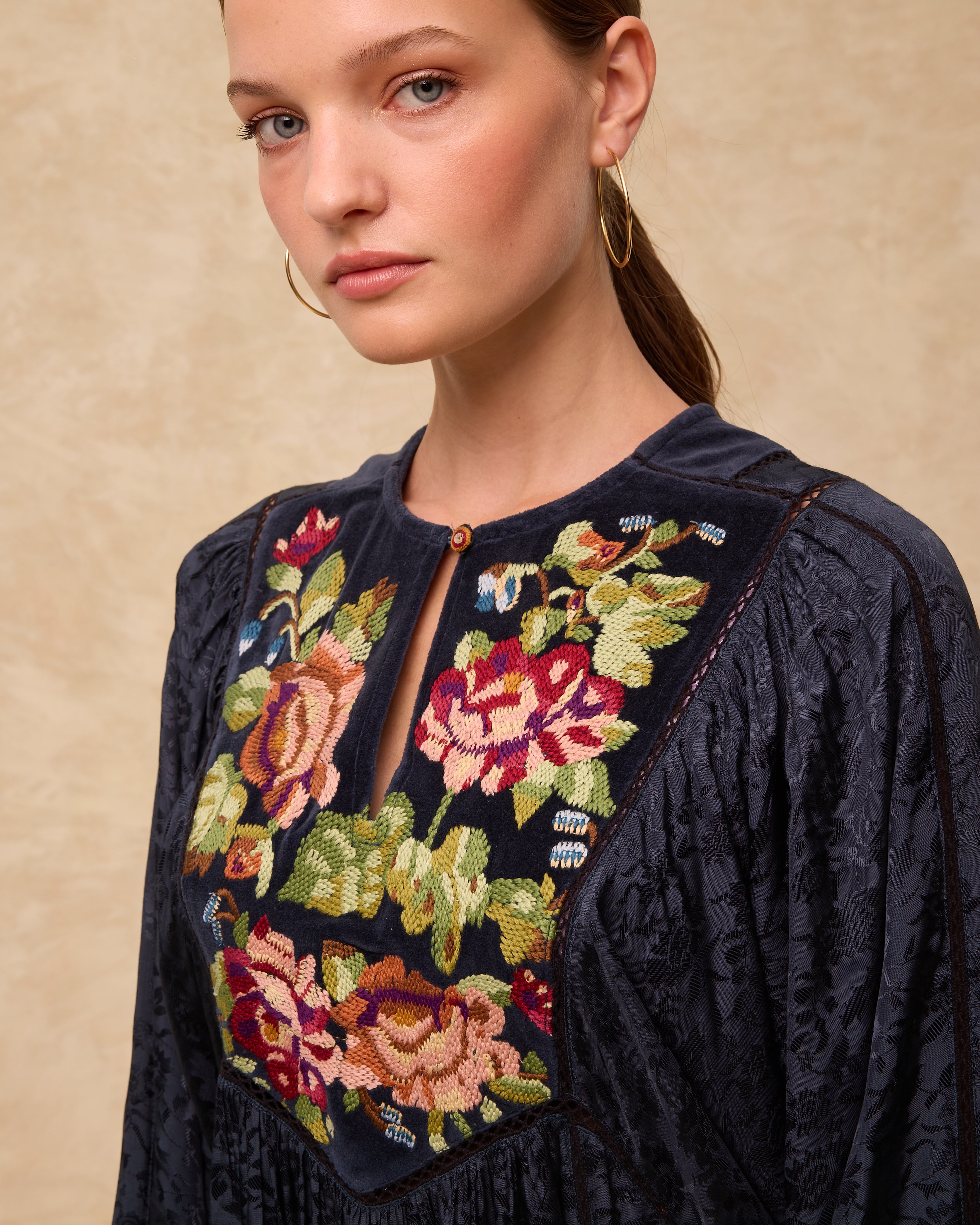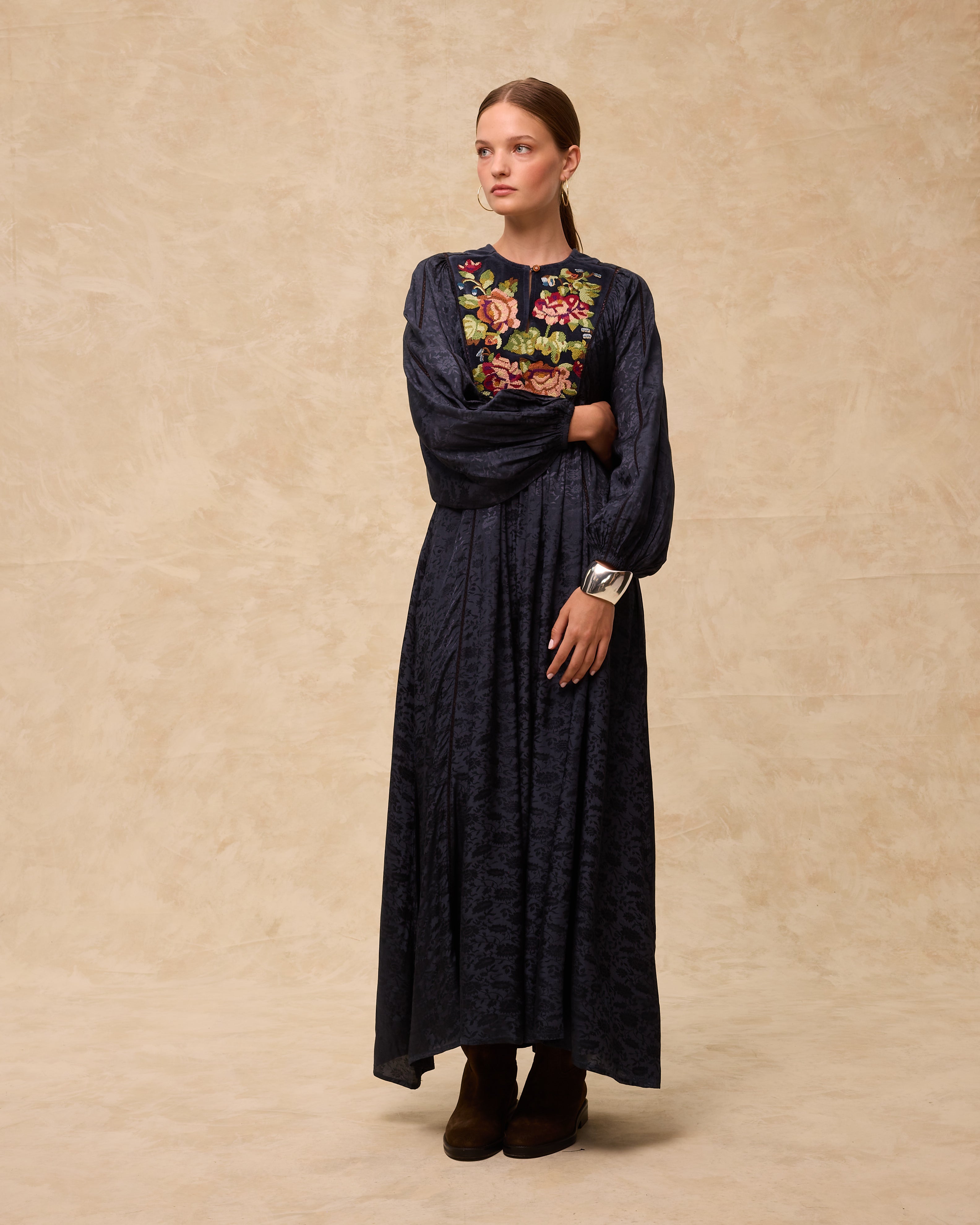 AMAL | Antrasit Jakarlı Nakışlı Midi Elbise