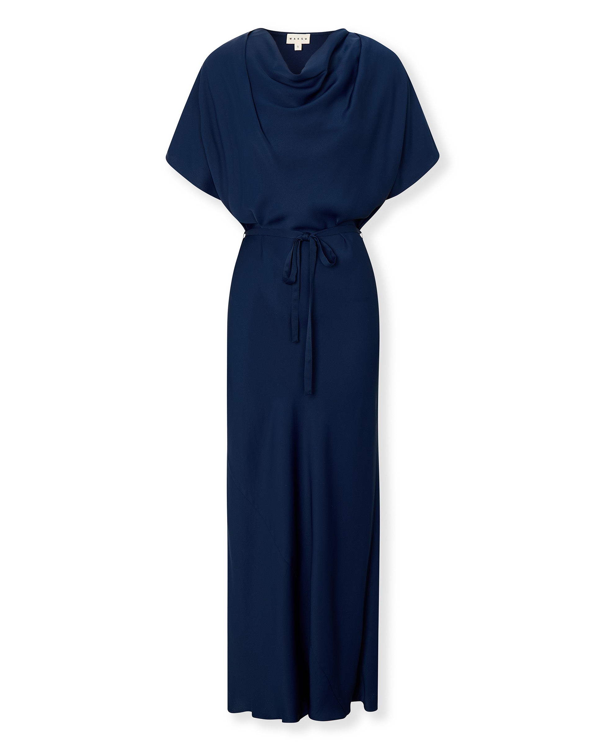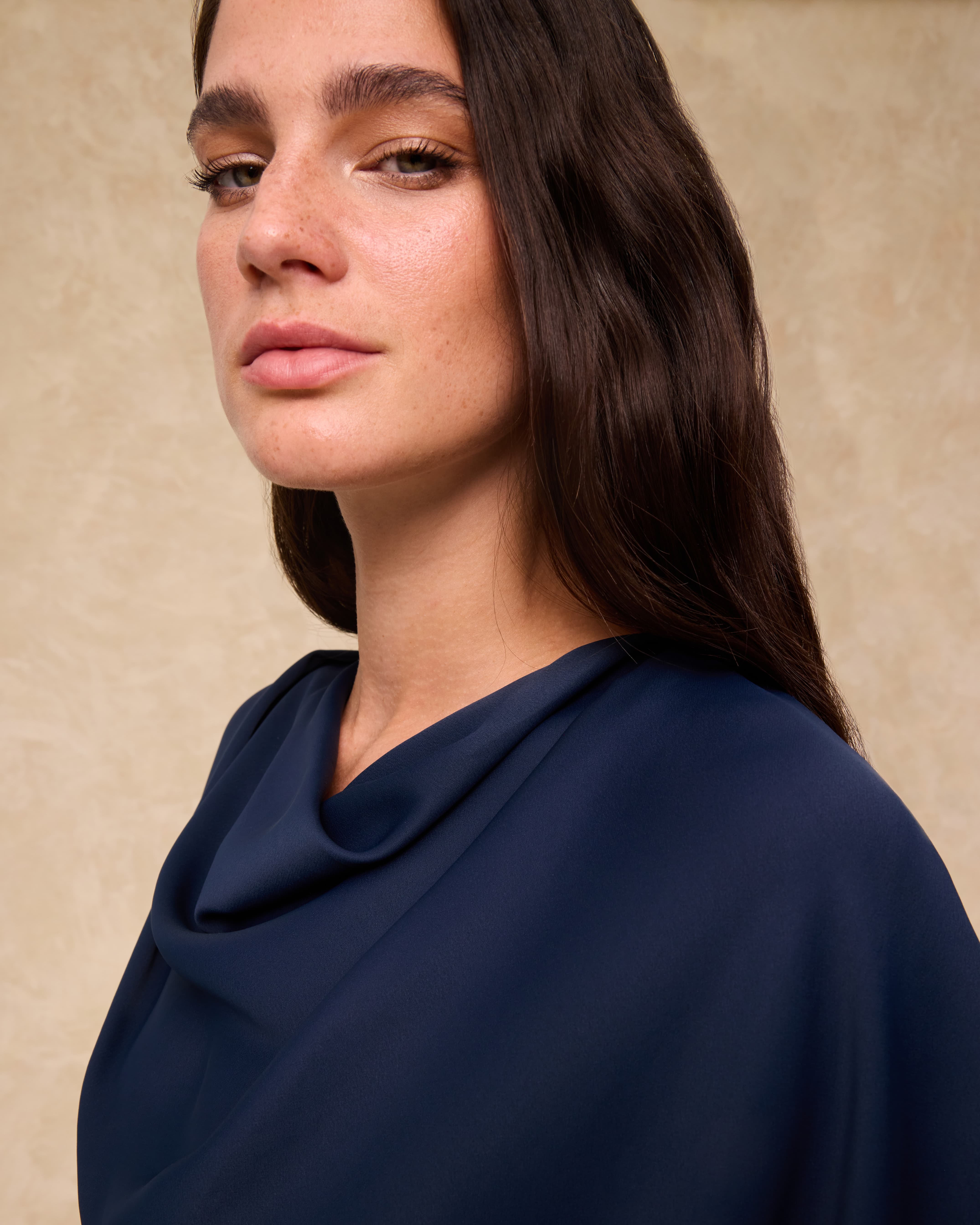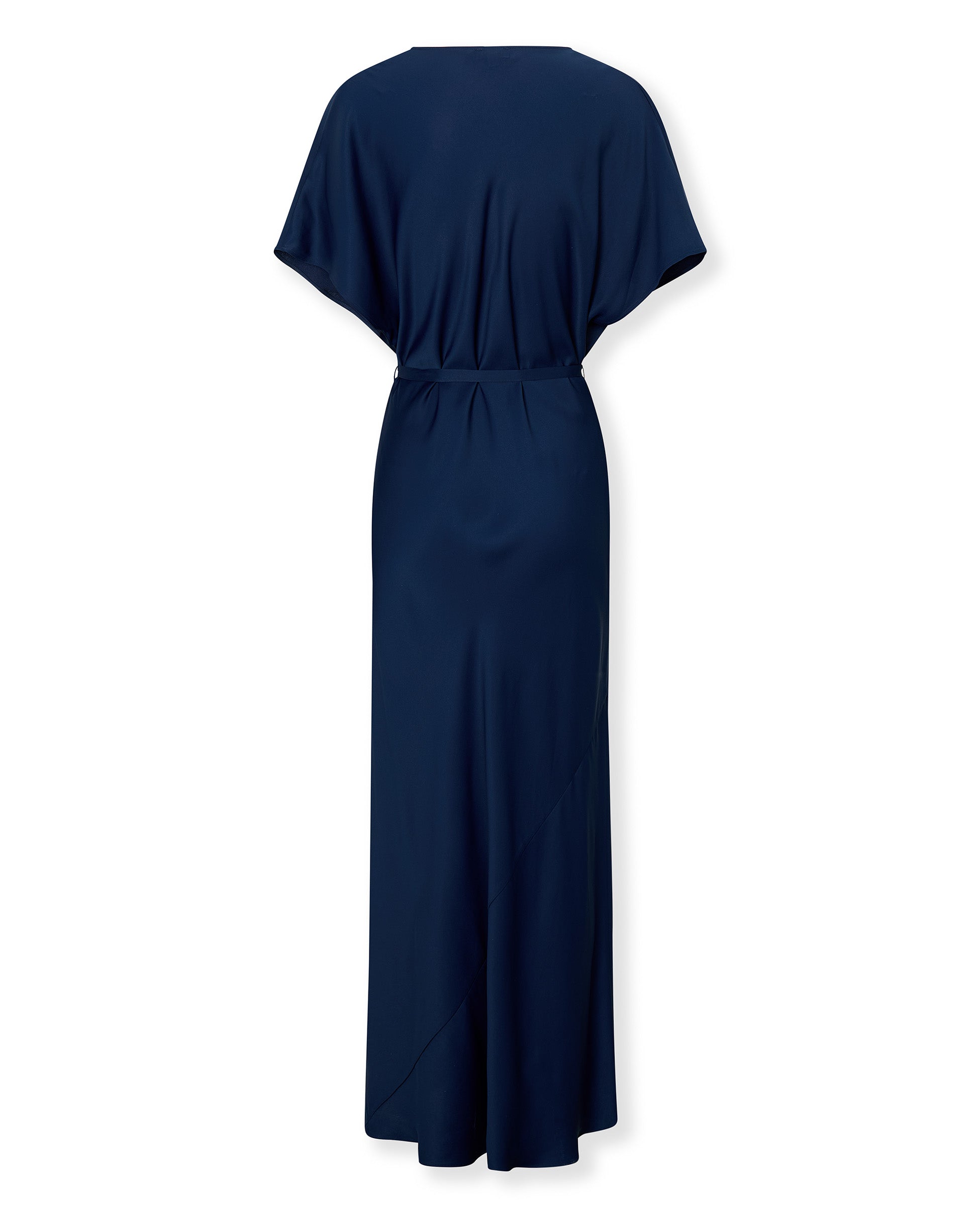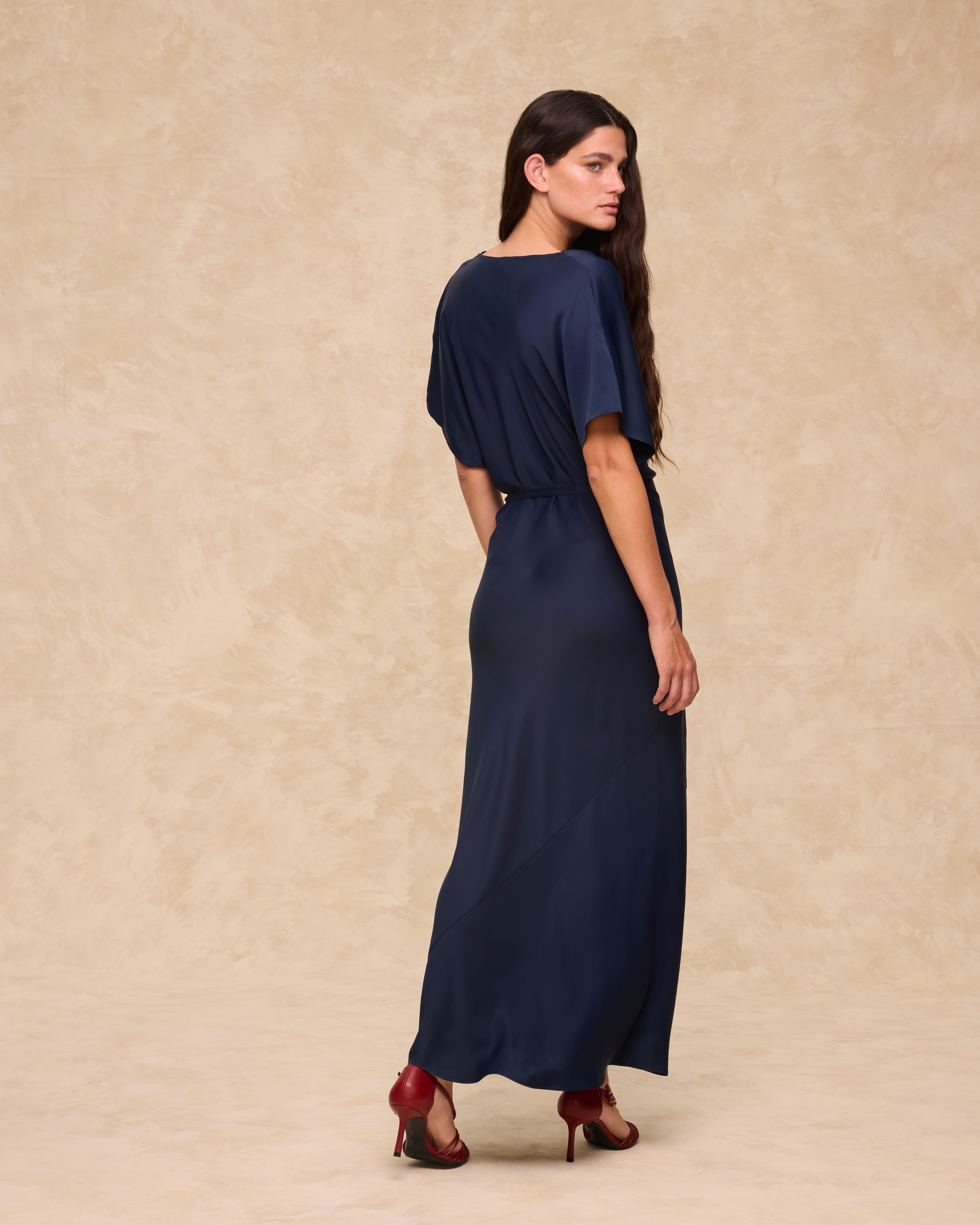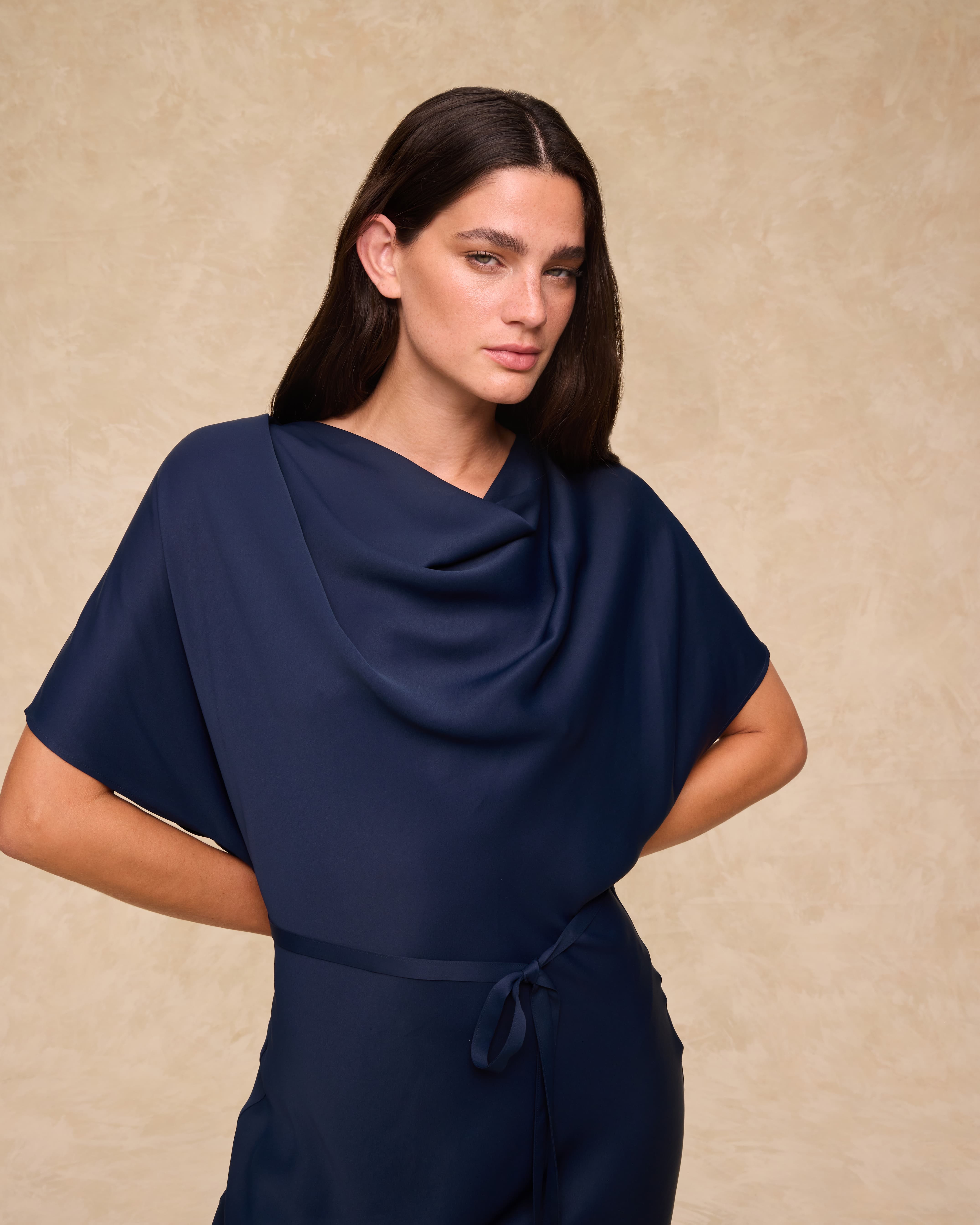 Zahmetsiz bir zarafete sahip Capri elbise, akıcı dökümlü ve hafif parlaklık taşıyan saten kumaştan üretilmiştir. Yarasakol kolları ve drapeli yakası, tasarıma yumuşaklık ve sofistike bir hava katarken, çıkarılabilir kuşağı silueti tercihe göre vurgulama imkânı sunar. Verev kesimli etek ucu, doğal bir hareket kazandırır.