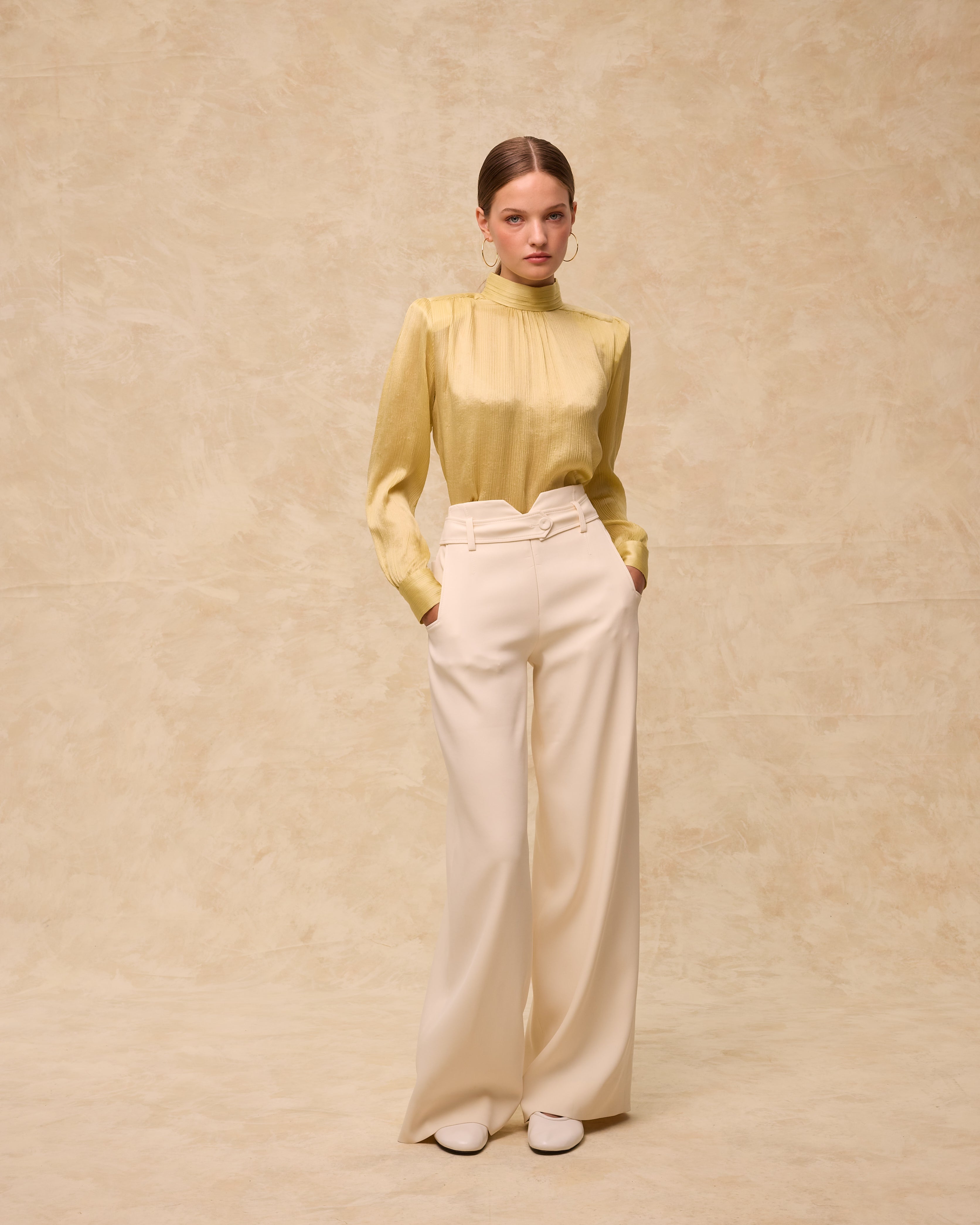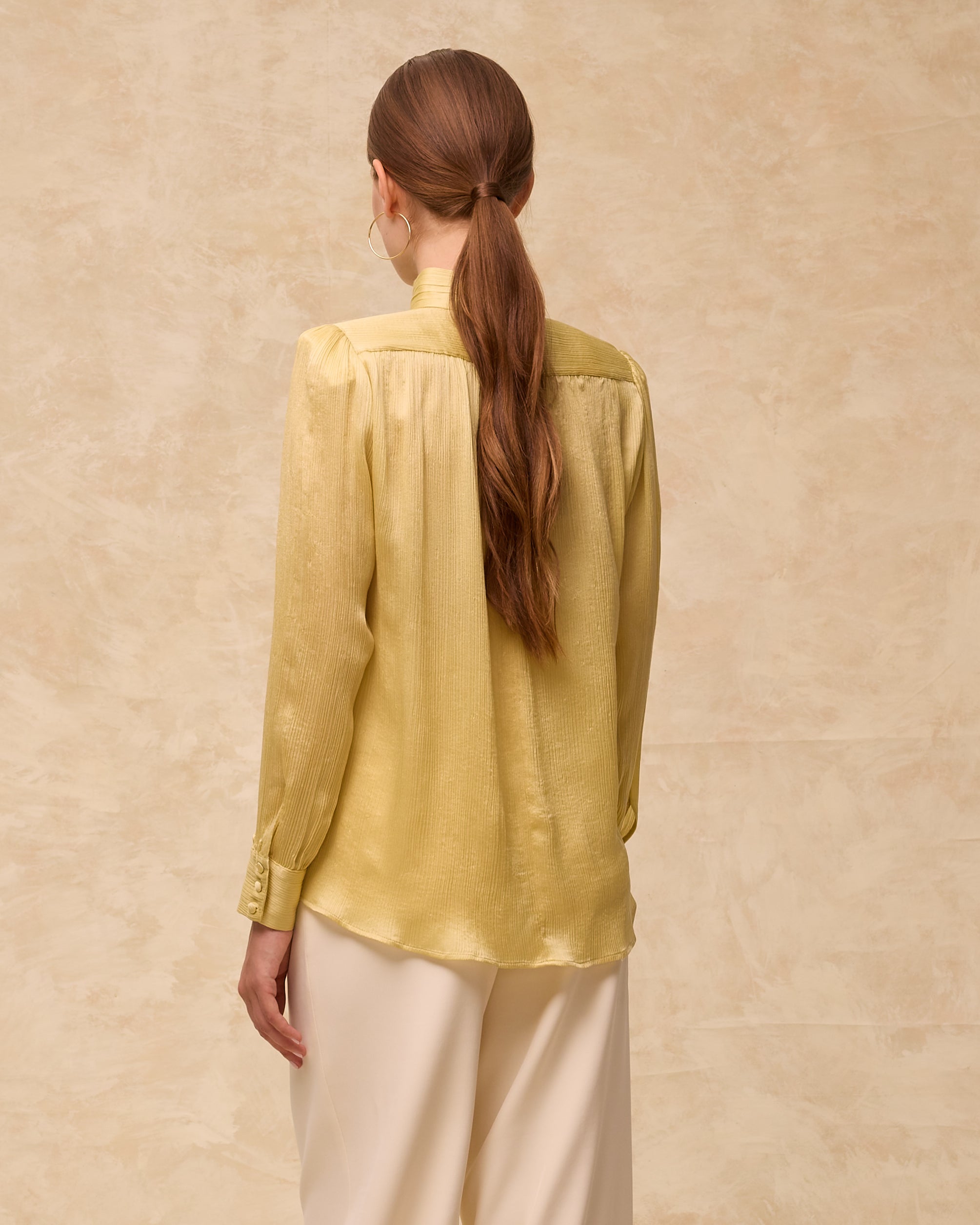 Zarif ve yumuşak bir yapıya sahip Carol bluz, %100 ipekten üretilmiş olup parlak açık chartreuse tonuyla öne çıkar. Ön kısmındaki ince pileler, rahat kesimle birleşirken hafif vatkalı omuzlar siluete nazikçe şekil verir. Büzgülü yüksek yaka ve yapılandırılmış manşetler sofistike detaylar sunarken, arkada ton-sur-ton kaplamalı düğmeli zarif bir damla kesimle tamamlanır.