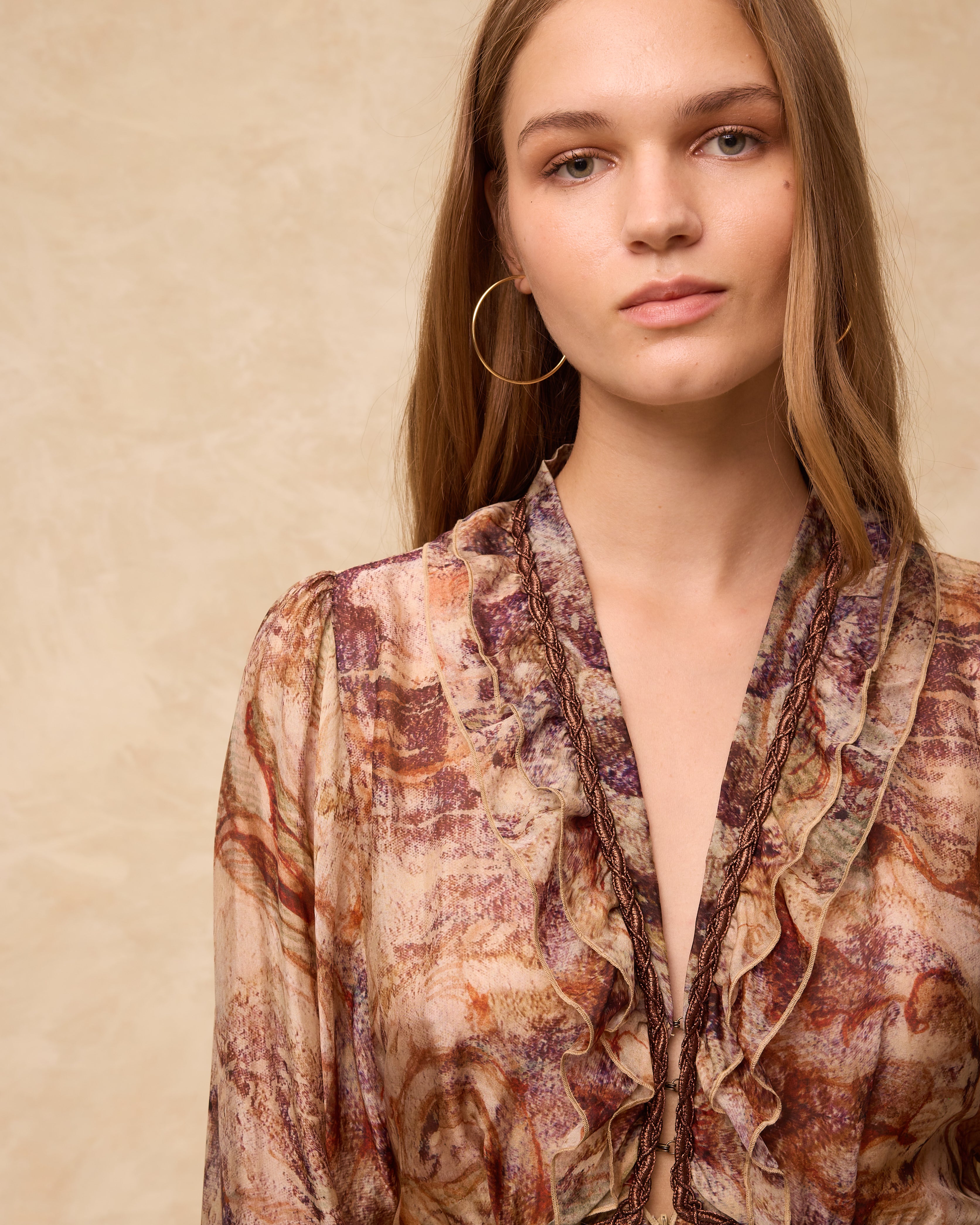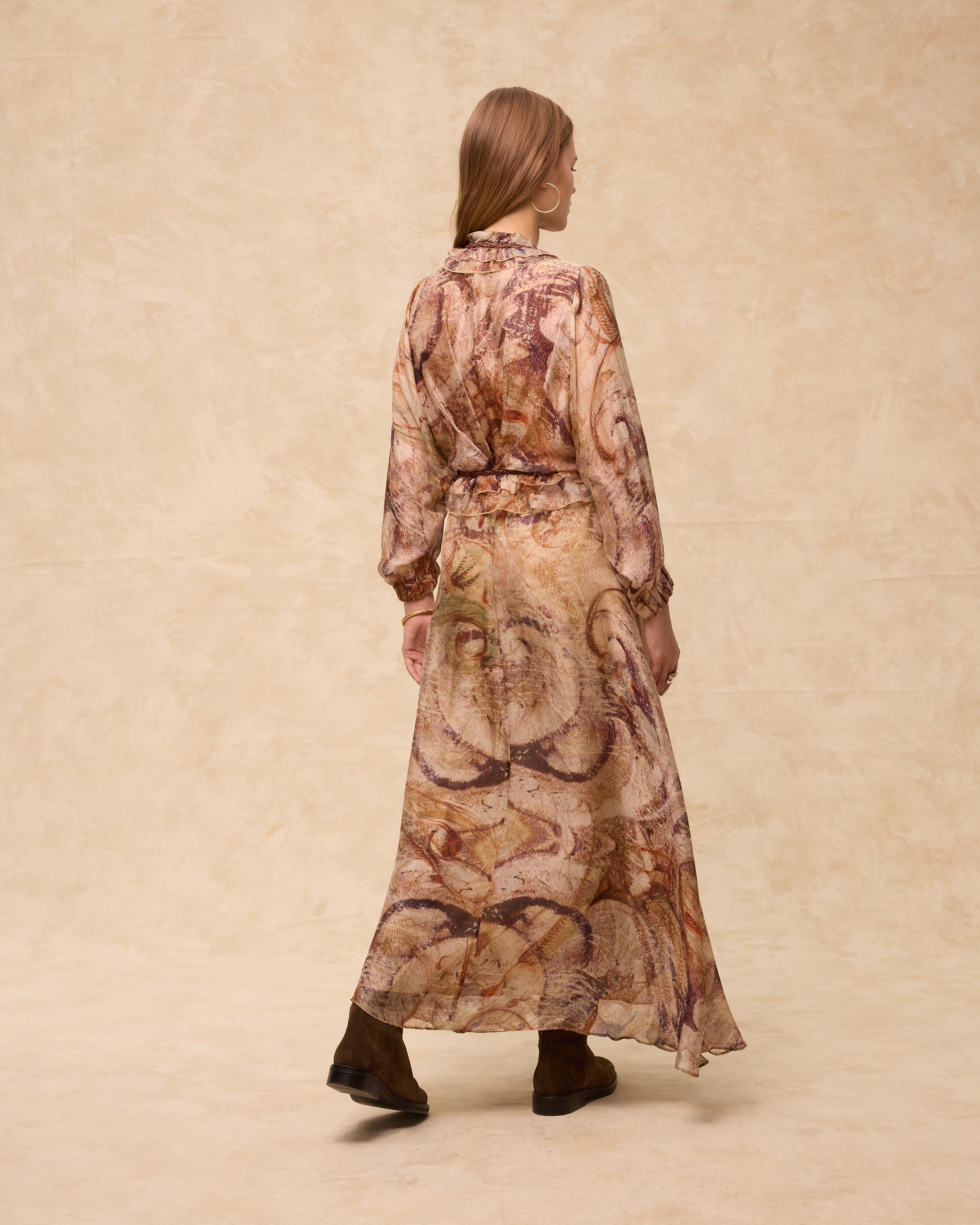 Romantik ve akıcı bir harekete sahip Marsiglia elbise, İtalyan kumaşıyla hazırlanmış yıkanabilir ipek karışımı üzerinde dijital mermer desenle öne çıkar. Silueti, yaka kısmındaki zarif volanlar, büzgülü manşetli uzun kollar ve astarlı kloş etek ile tamamlanır. Ön kısımda küçük çıtçıtlar ve gizli fermuarla temiz bir bitiş sunar.