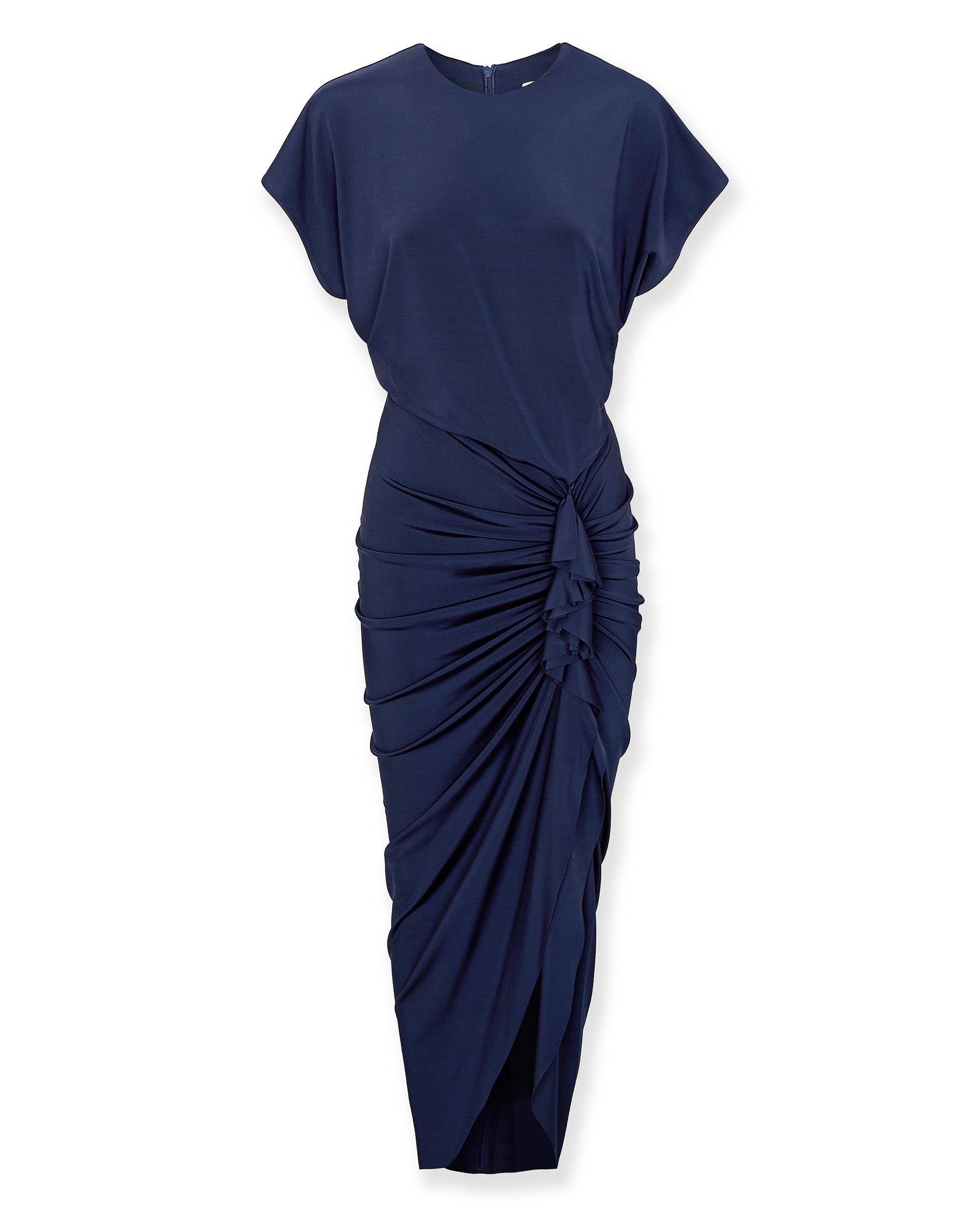Heykelsi ve akıcı bir görünüme sahip Michaela elbise, zarif drapeleri ve yumuşak hareketiyle öne çıkar. Derin lacivert tonunda tasarlanan model, rahat kesimli gövde, büzgülü bel ve yan yırtmaçla birleşen asimetrik volan detayıyla feminen bir siluet sunar. Arkadaki gizli fermuar, kusursuz bir bitiş sağlar.
