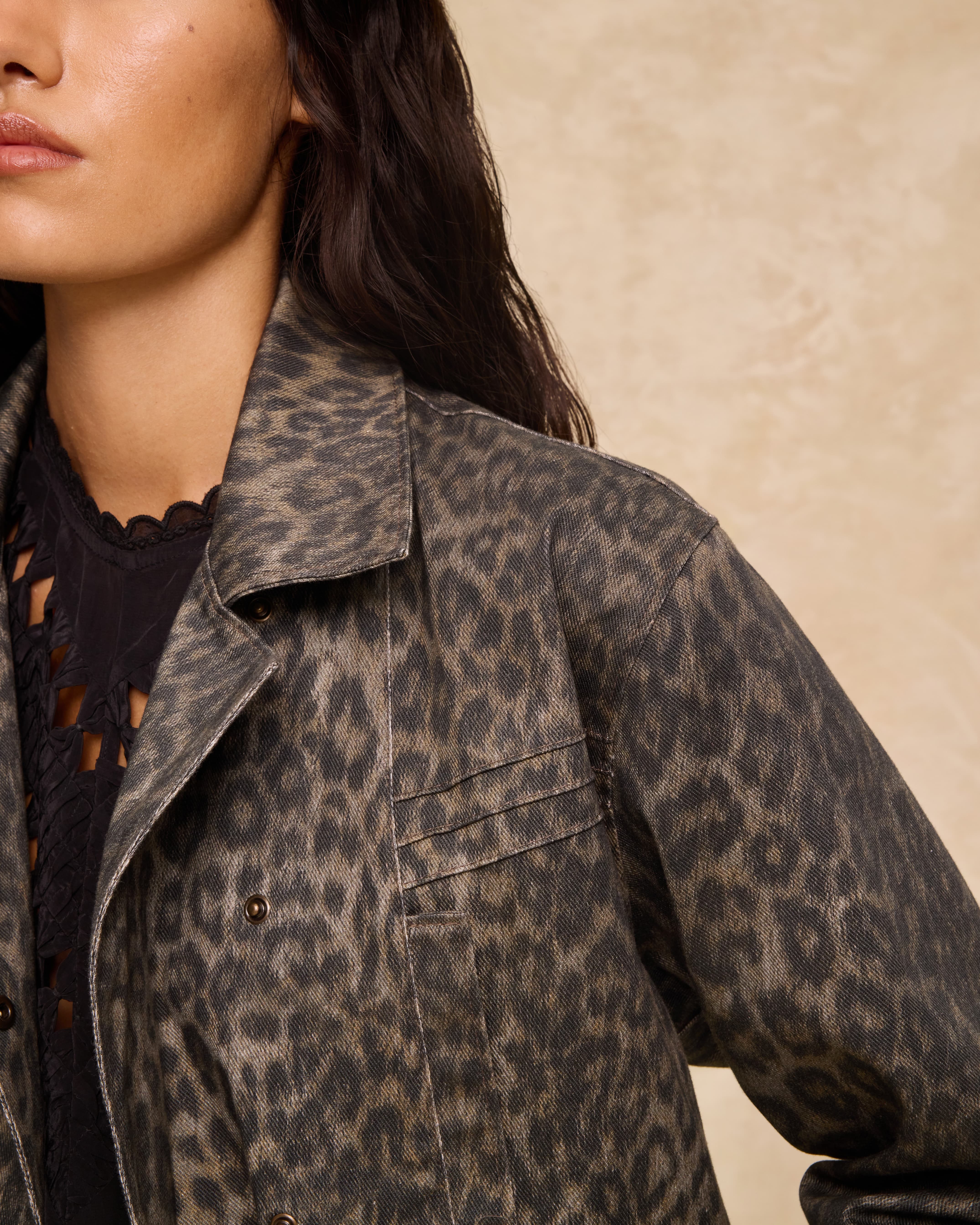 Olivia ceket, klasik terziliği feminen ve güçlü bir tavırla yeniden yorumlar. Pamuk kumaştan üretilen model, tonal leopar deseni ve rahat kesimiyle öne çıkar. Kapaklı cepler ve metal çıtçıtlı ön kapama, fonksiyonel bir detay sunarken, rahat silueti katmanlı giyime uyum sağlar.