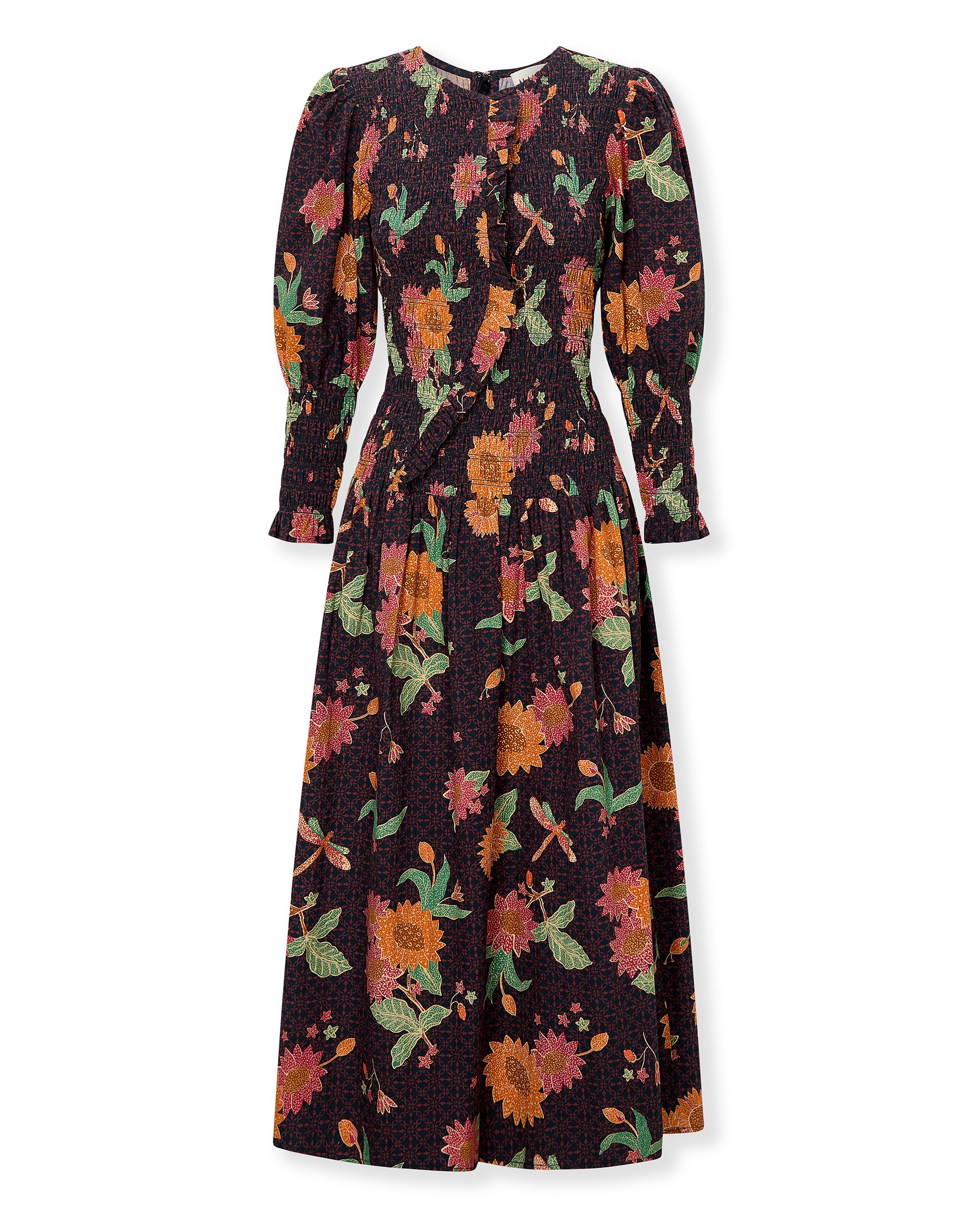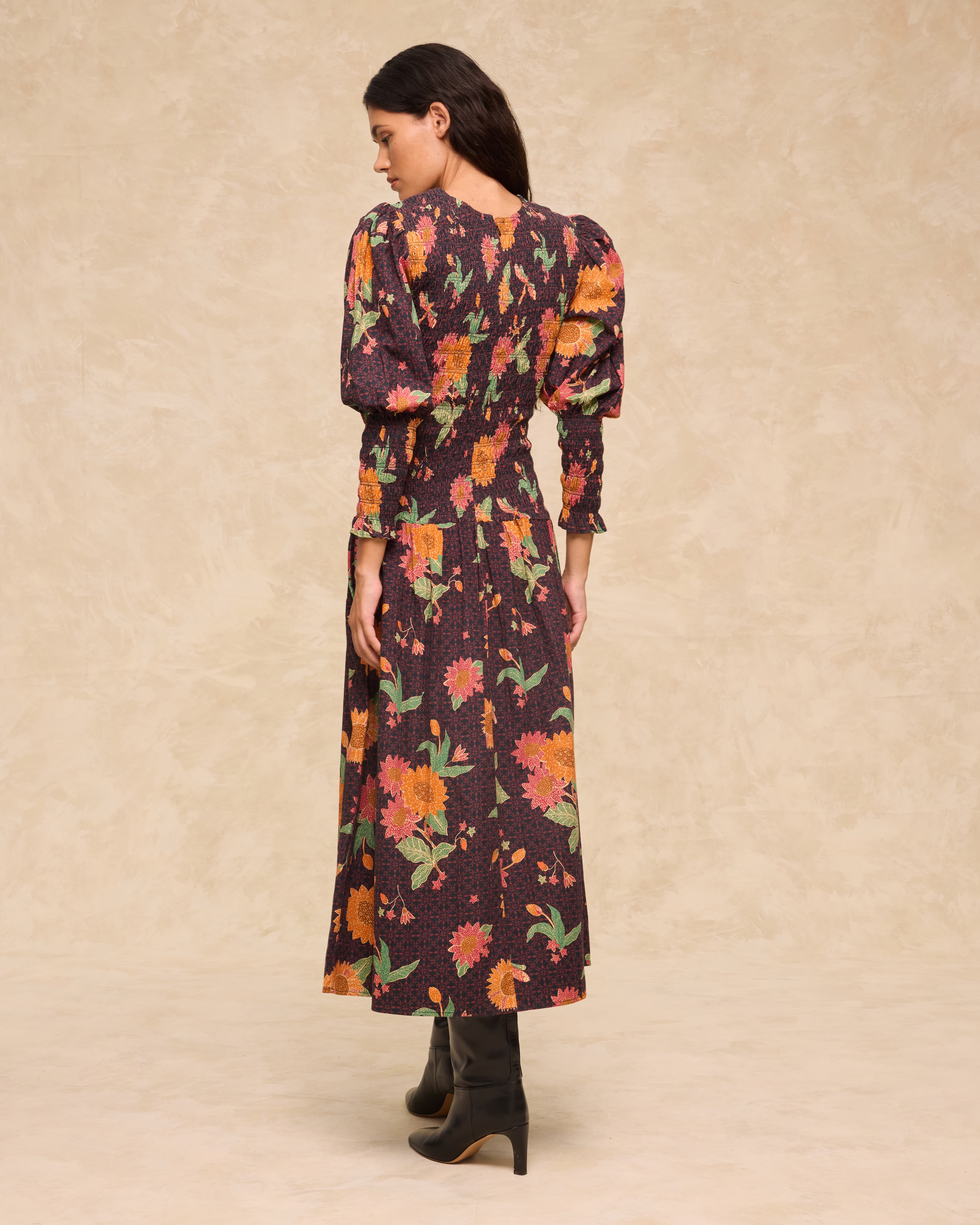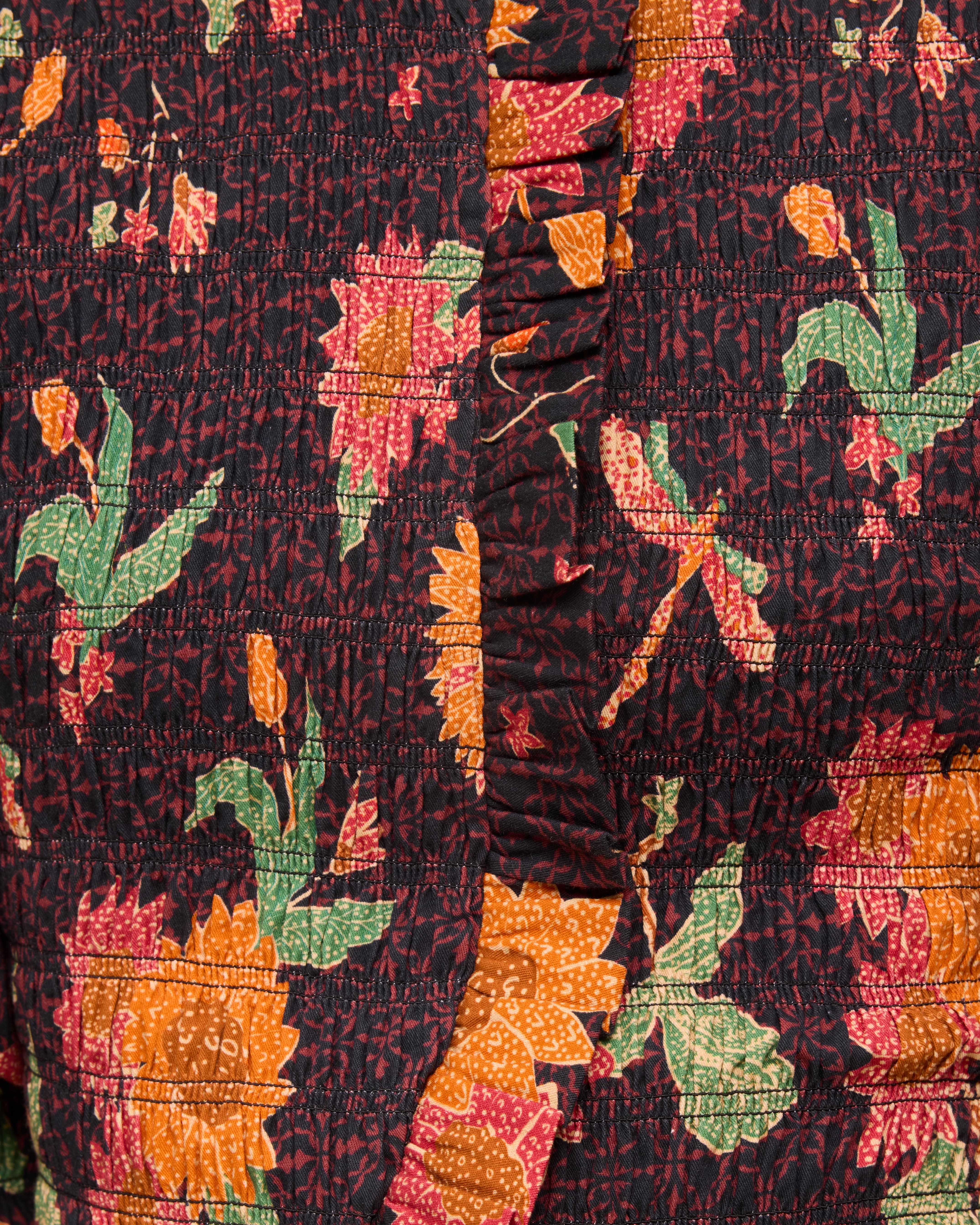 Canlı çiçek desenleri ve büzgülü doku, Scarlet elbisede feminen bir uyum yakalar. %100 pamuktan üretilen model, yapılandırılmış kabarık kollar ve yumuşak toplanmış eteğiyle öne çıkar. Ön kısımdaki volan detayları ve arkadaki gizli fermuar, tasarımı sofistike bir şekilde tamamlar.